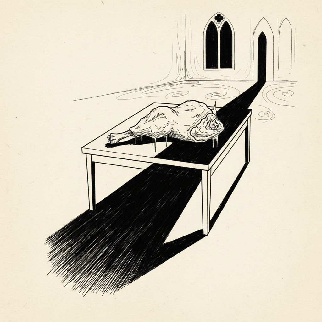 Traditionally a symbol of innocence and sacrifice (Jesus as the Lamb). Dahl inverts this: the instrument of nurture (food) becomes the instrument of death. Mary is the 'Lamb' who becomes the butcher.