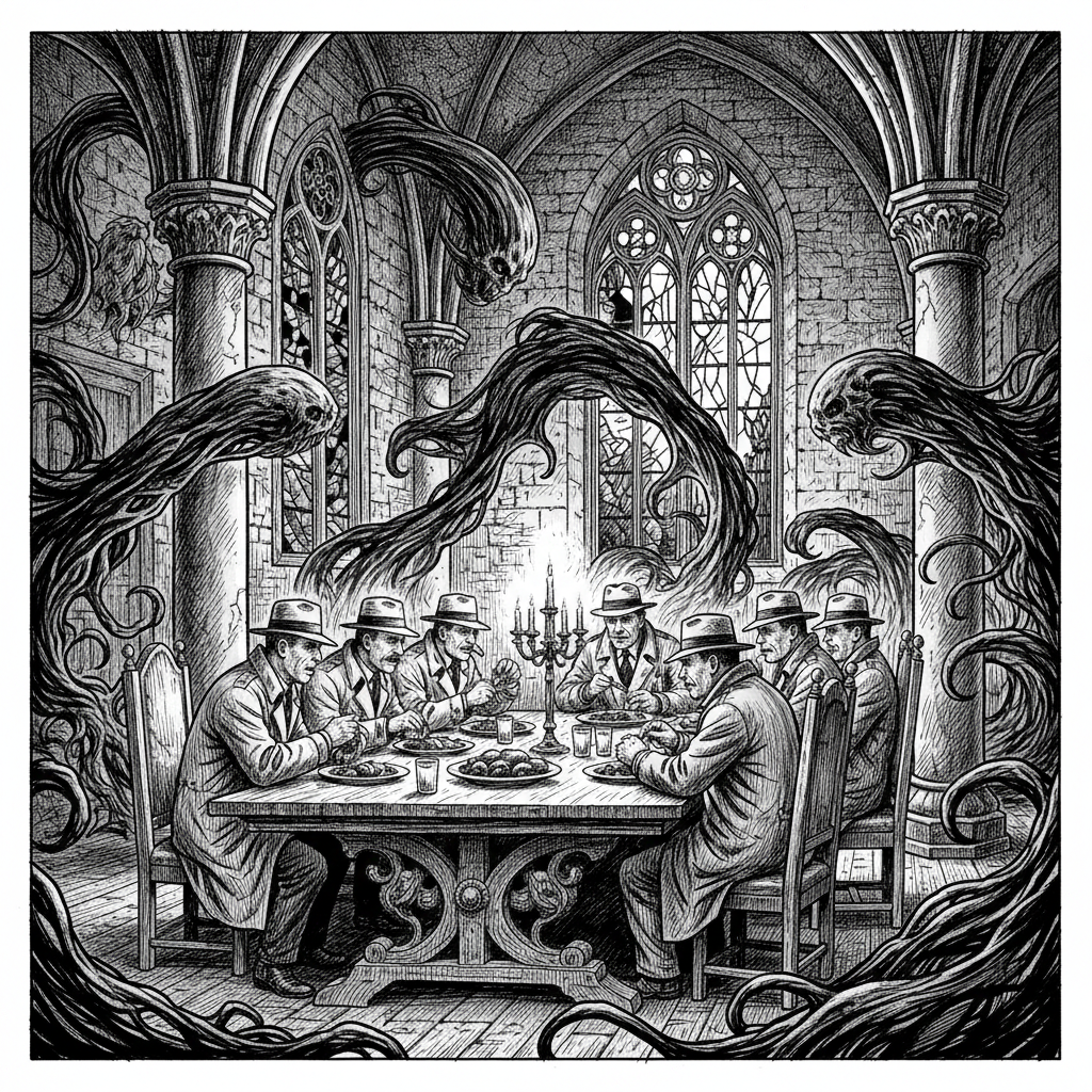The story relies on the juxtaposition of the mundane and the macabre. The image of the police officers eating the evidence is a grotesque tableau—a Gothic feast where the line between civilization (lawmen) and savagery (eating the murder weapon) is blurred.