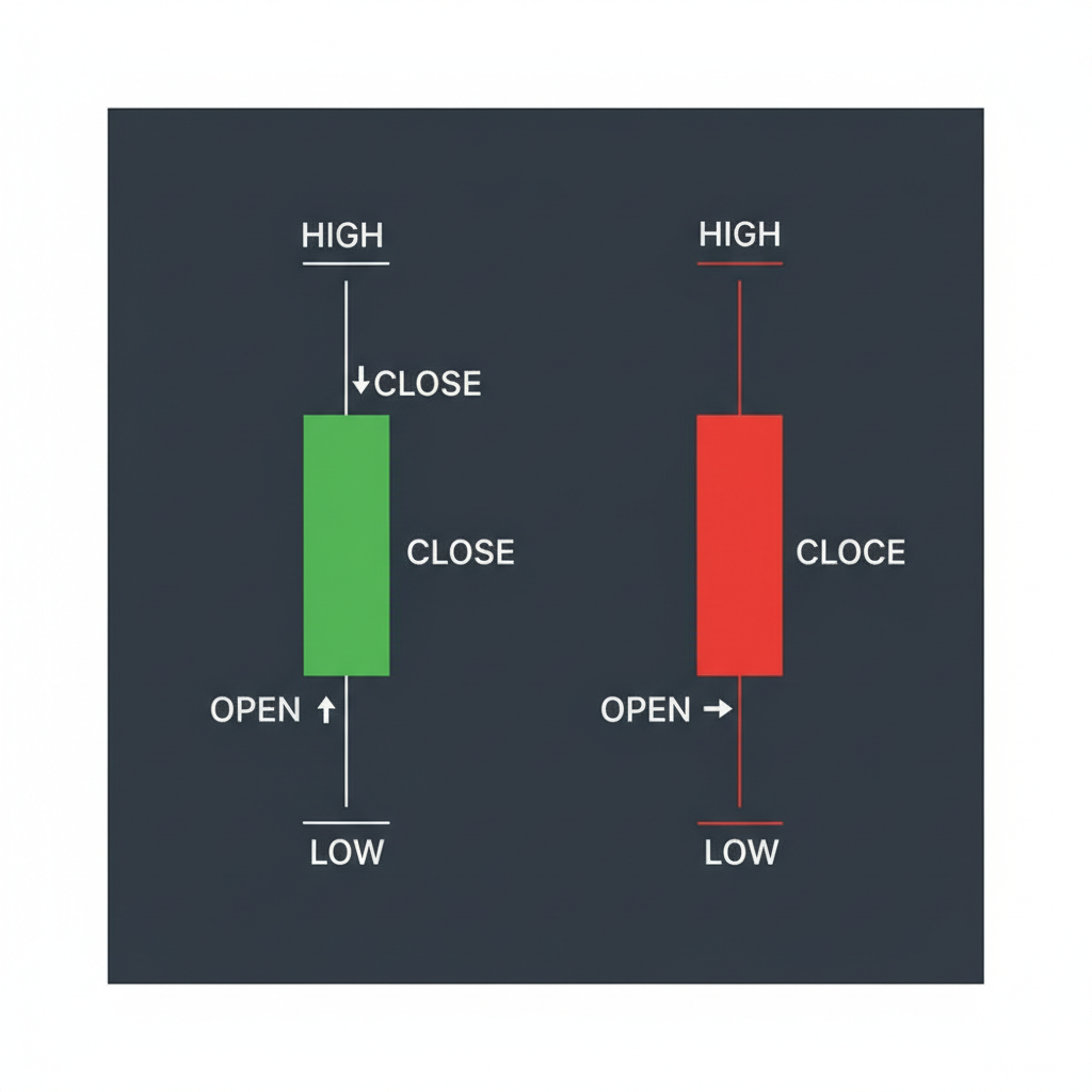 • BODY: The range between Open and Close.<br>• WICK (Shadow): The High and Low extremes.<br>• COLOR: Green = Price went UP (Bullish). Red = Price went DOWN (Bearish).