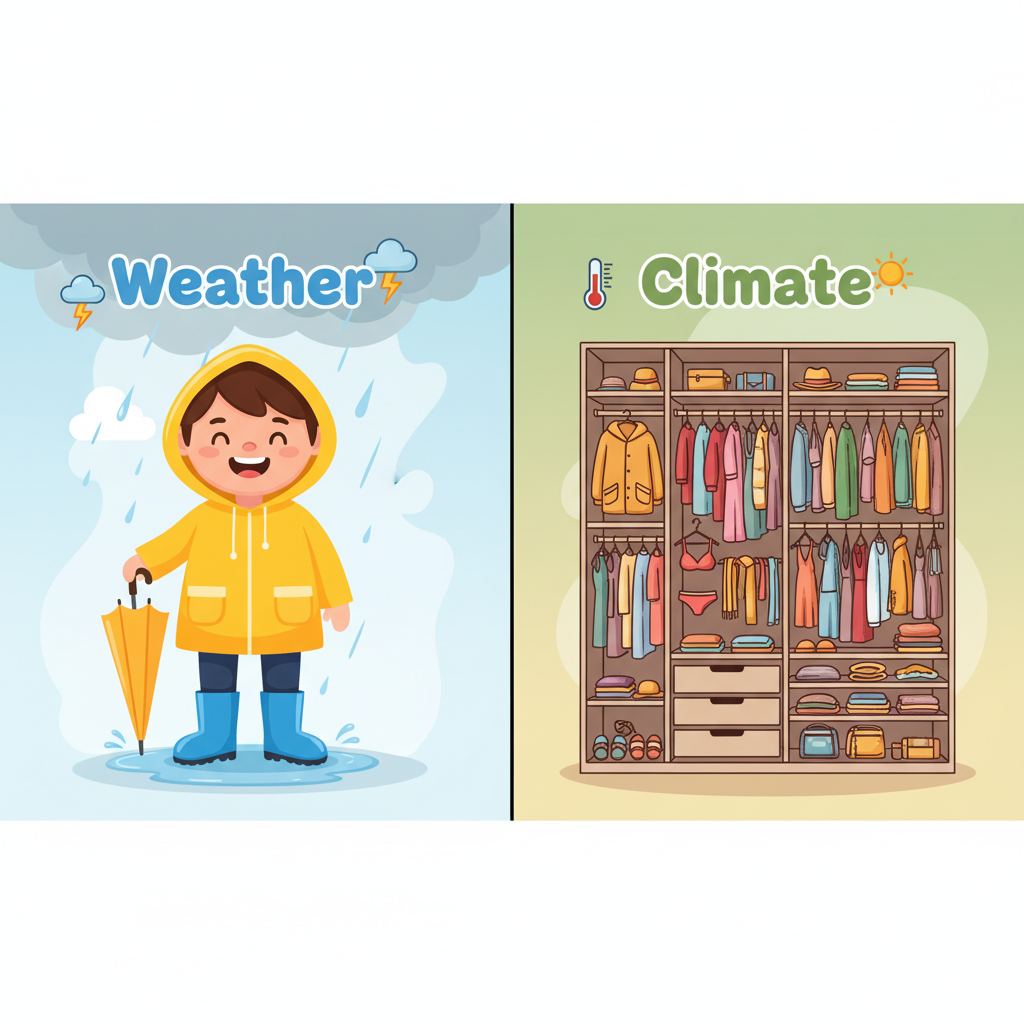 TEACHER SCRIPT (Turn and Talk): 'Here is the rule: Weather is your outfit. Climate is your closet. Turn to your partner. Tell them: Is a thunderstorm today weather or climate? Why? You have 30 seconds. Go!'