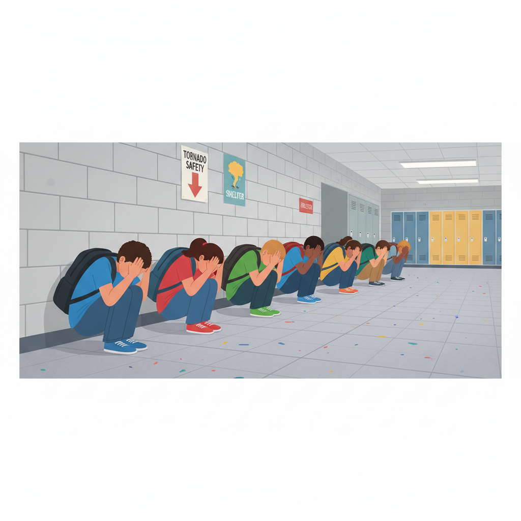 TEACHER SCRIPT (Active Practice): 'We are going to practice the position shown in the picture. When I say GO, stand up and show me the Tuck and Cover position next to your desk. 3, 2, 1, GO!' [Monitor and correct].