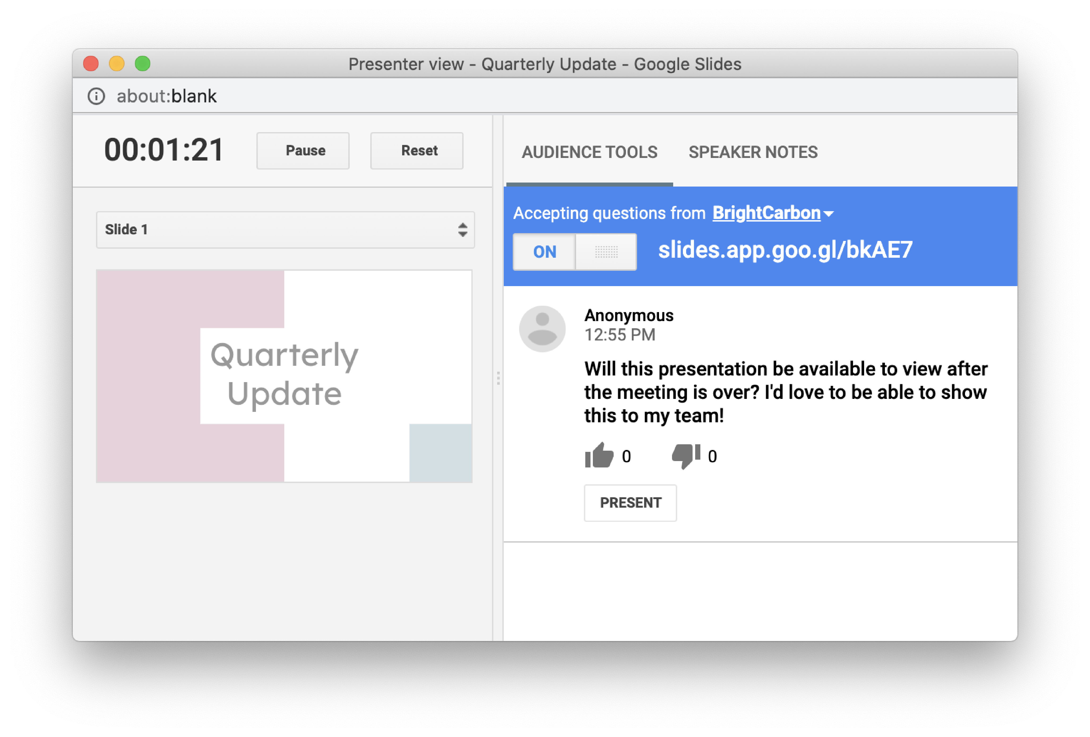Google Slides has a built-in Q&A tool. Turning this on creates a link where your audience can submit questions in real-time.