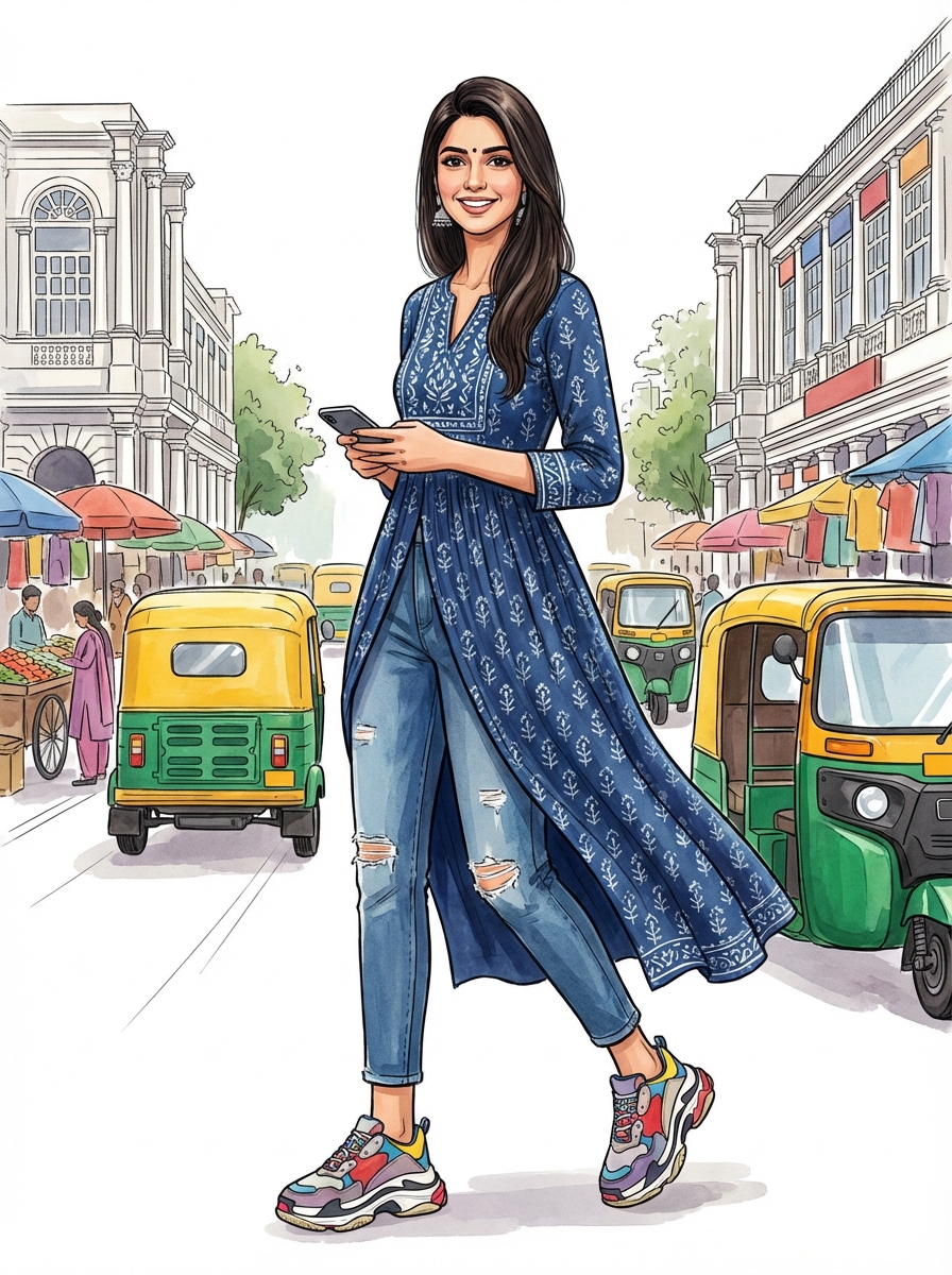 <strong>Indo-Western Fashion:</strong> The saree is now worn with crop tops, or Kurtas with jeans. It's not about replacing tradition, but remixing it.