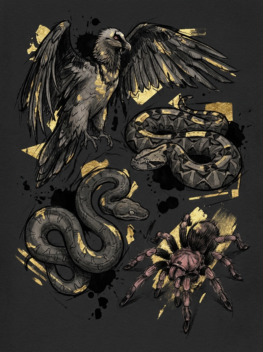 Bearded Vulture, Gaboon Viper, Emerald Tree Boa & Pink Bloom Tarantula