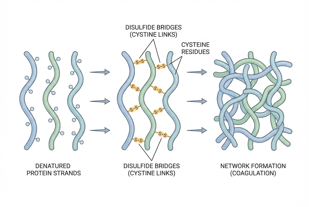 2. Ponts Disulfure (S-S) : Les acides aminés cystéine contiennent du soufre. Avec la chaleur, les groupes -SH forment des liaisons covalentes solides inter-chaînes.
