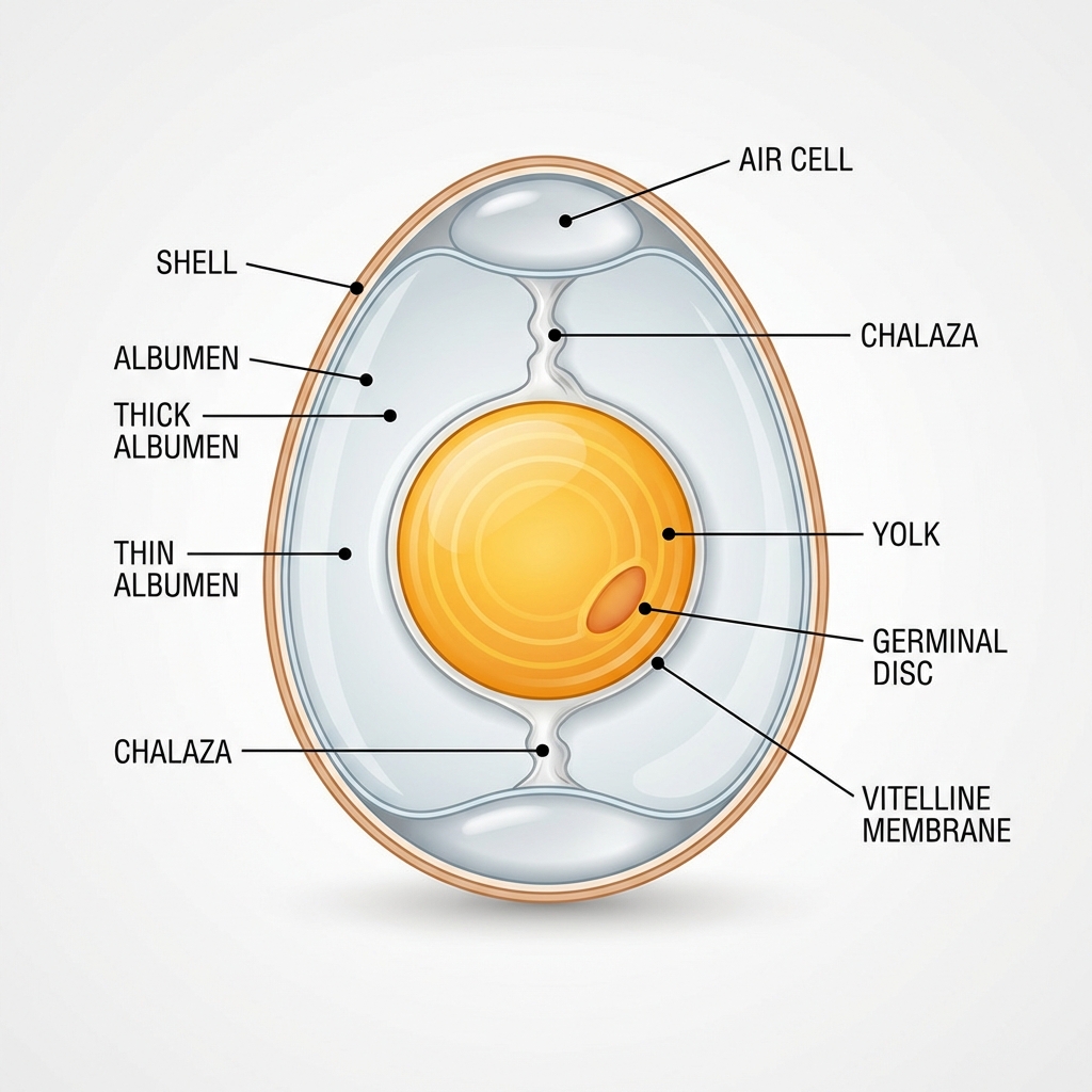 Vitellus (Jaune) : Riche en lipides, cholestérol et protéines émulsifiantes (lécithine).