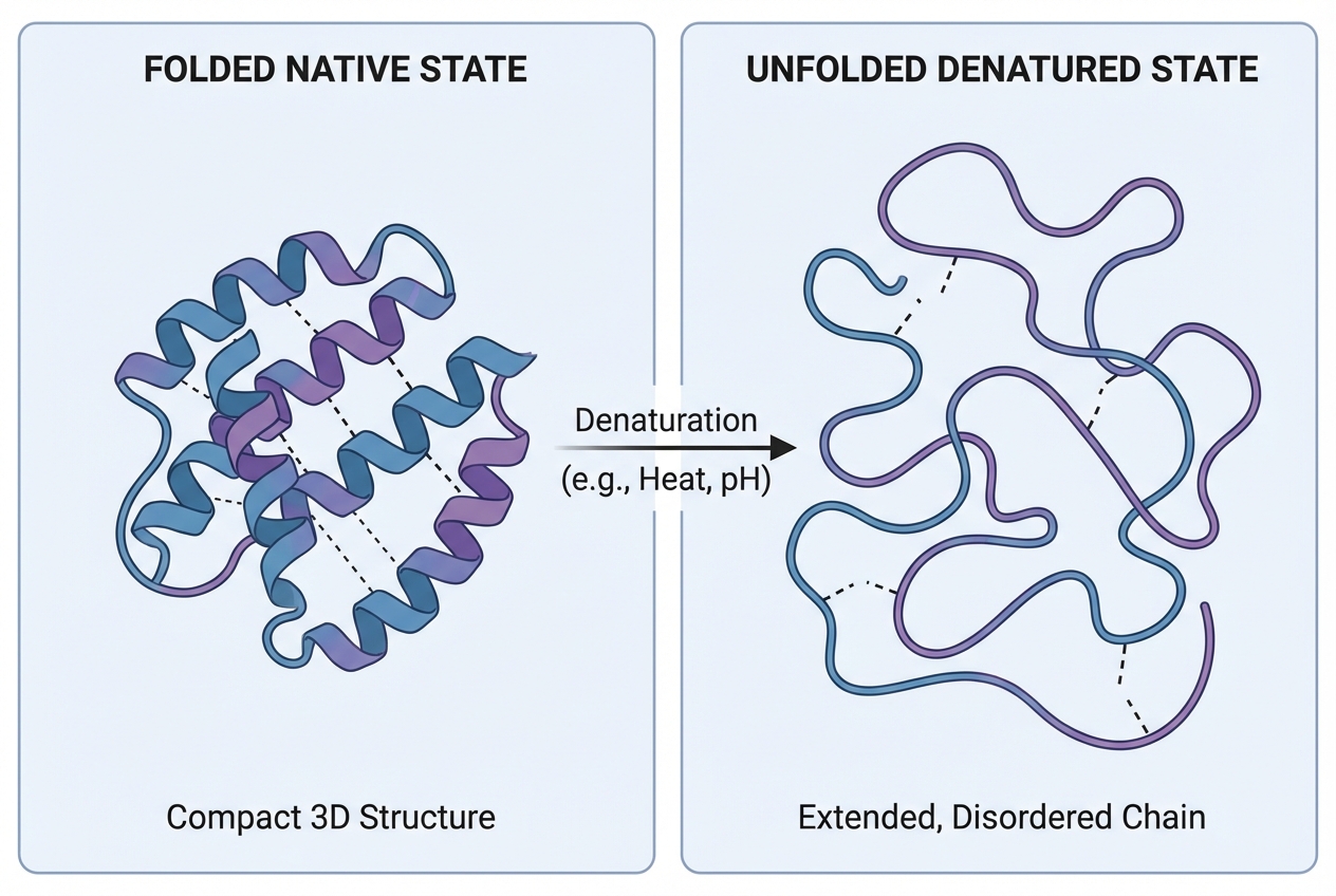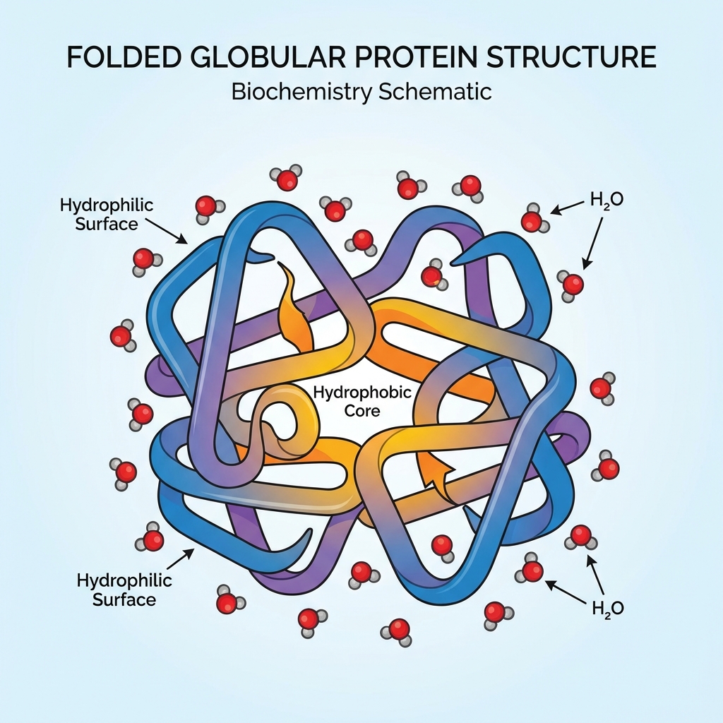 À l'état cru, les protéines comme l'ovalbumine sont globulaires et repliées sur elles-mêmes. • Structure tertiaire stable : Maintenue par des liaisons faibles (hydrogène, ioniques) et des ponts disulfure intramoléculaires. • Configuration : Les acides aminés hydrophobes sont enfouis au cœur de la protéine, loin de l'eau. • Les acides aminés hydrophiles sont exposés en surface, permettant la solubilité dans l'eau.
