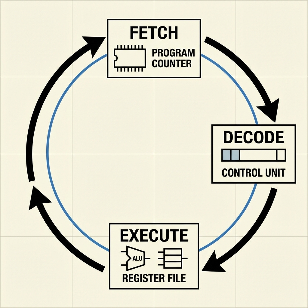 EXECUTE: The instruction is carried out. This may involve the ALU (calculations), reading/writing to memory, or changing the PC (jumps).