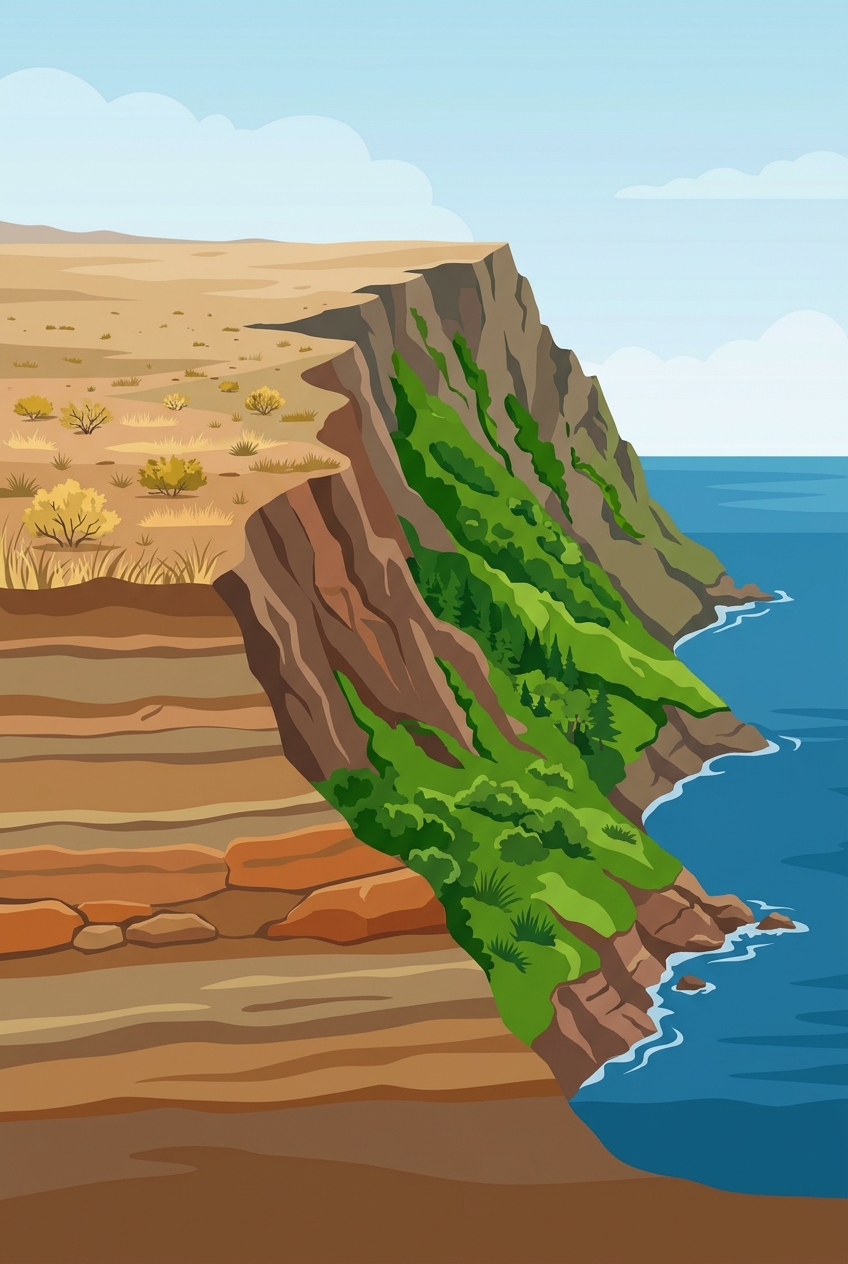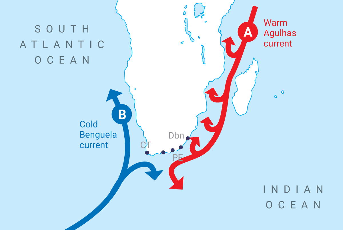 🔵 Cold current → cools coast, brings dry conditions