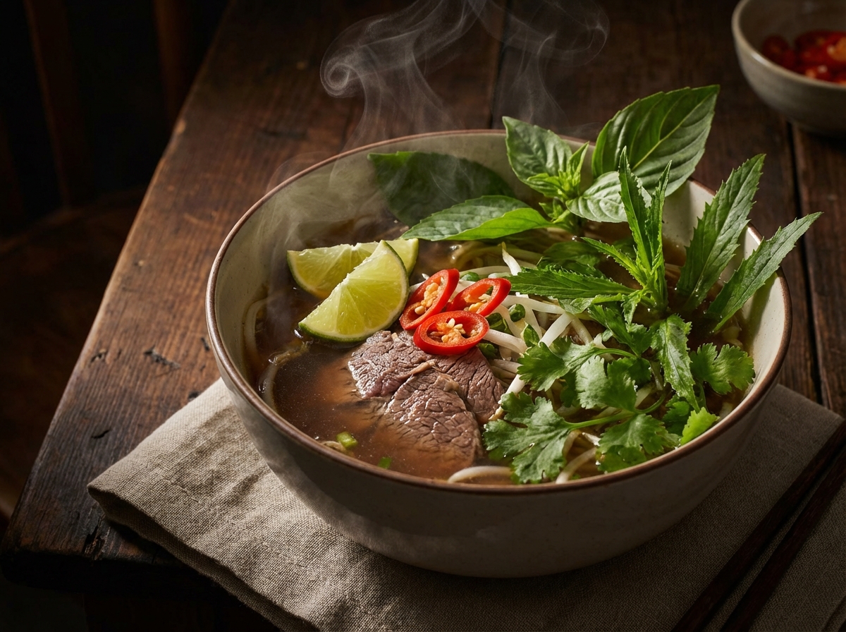 Die Seele der vietnamesischen Küche. Eine kräftige Rinderbrühe mit Reisnudeln, frischen Kräutern und Gewürzen – das klassische Frühstück der Hanoier.