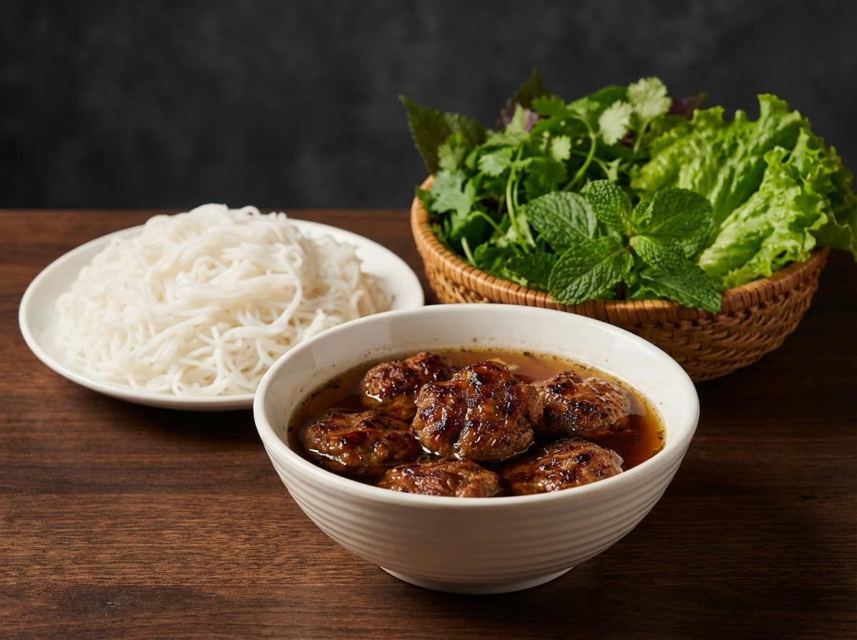 Gegrillte Schweinefleischbällchen in einer süß-sauren Fischsauce, serviert mit Reisnudeln. Ein aromatisches Mittagessen, das durch Barack Obama weltberühmt wurde.