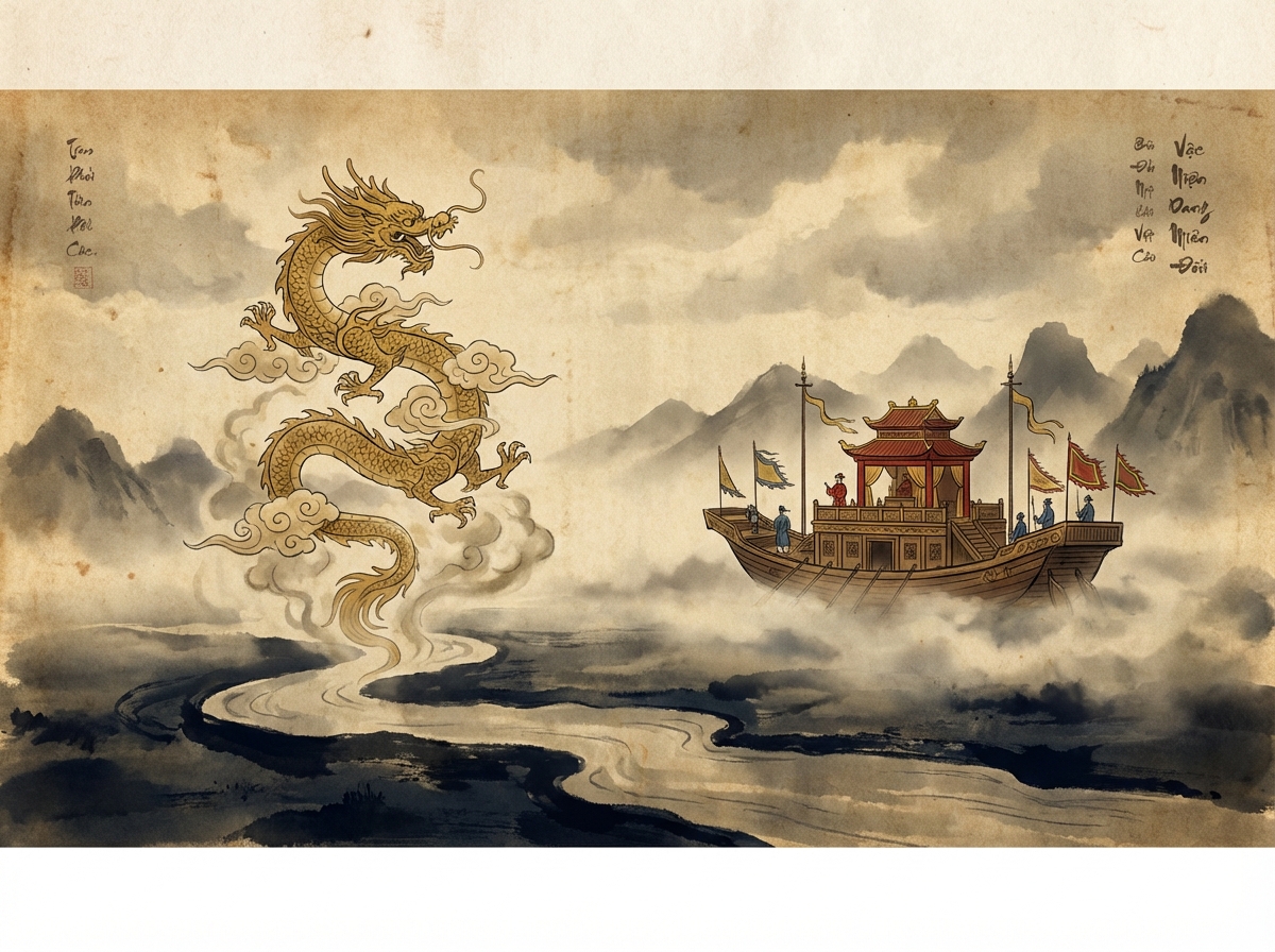 Als die königliche Flotte am Ufer des Roten Flusses anlegte, erschien der Legende nach ein goldener Drache, der majestätisch in den Himmel emporstieg. Zu Ehren dieses Zeichens benannte der König die neue Hauptstadt Thăng Long – „Stadt des aufsteigenden Drachen“.