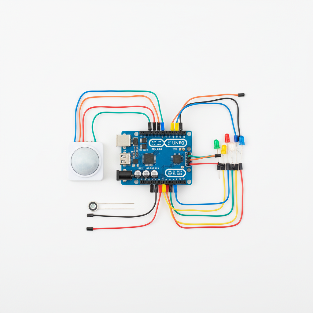 Tinkercad ортасында Arduino және PIR датчигі көмегімен 'Ақылды жарықтандыру' жүйесін жасау жолдары мен C++ кодын үйреніңіз.