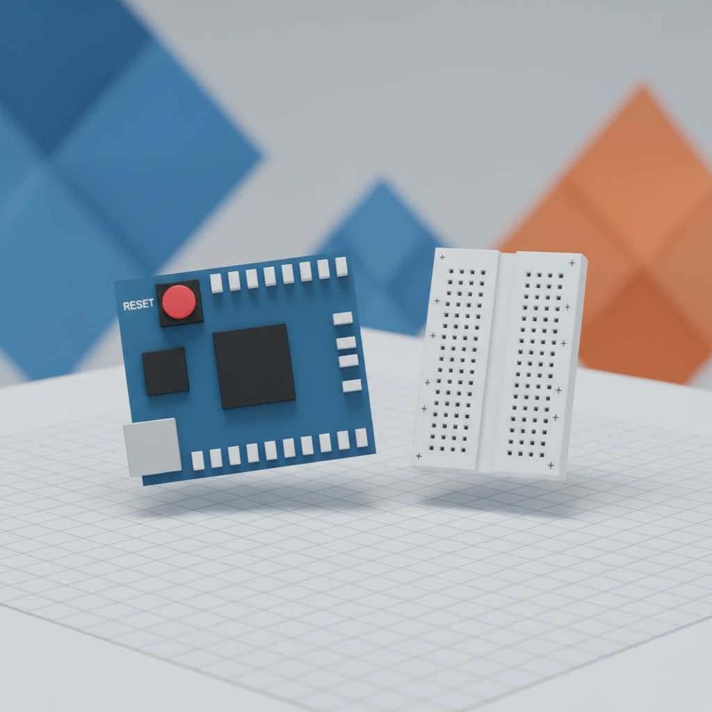 Алдымен Tinkercad.com сайтына кіріп, 'Circuits' бөлімінде жаңа жоба ашамыз. Оң жақ панельден керекті компоненттерді жұмыс алаңына сүйреп әкелеміз. Нан тақтасын (Breadboard) орнатып, Arduino-дан 5V (қызыл) және GND (қара) сымдарын жалпы қуат жолдарына қосамыз.