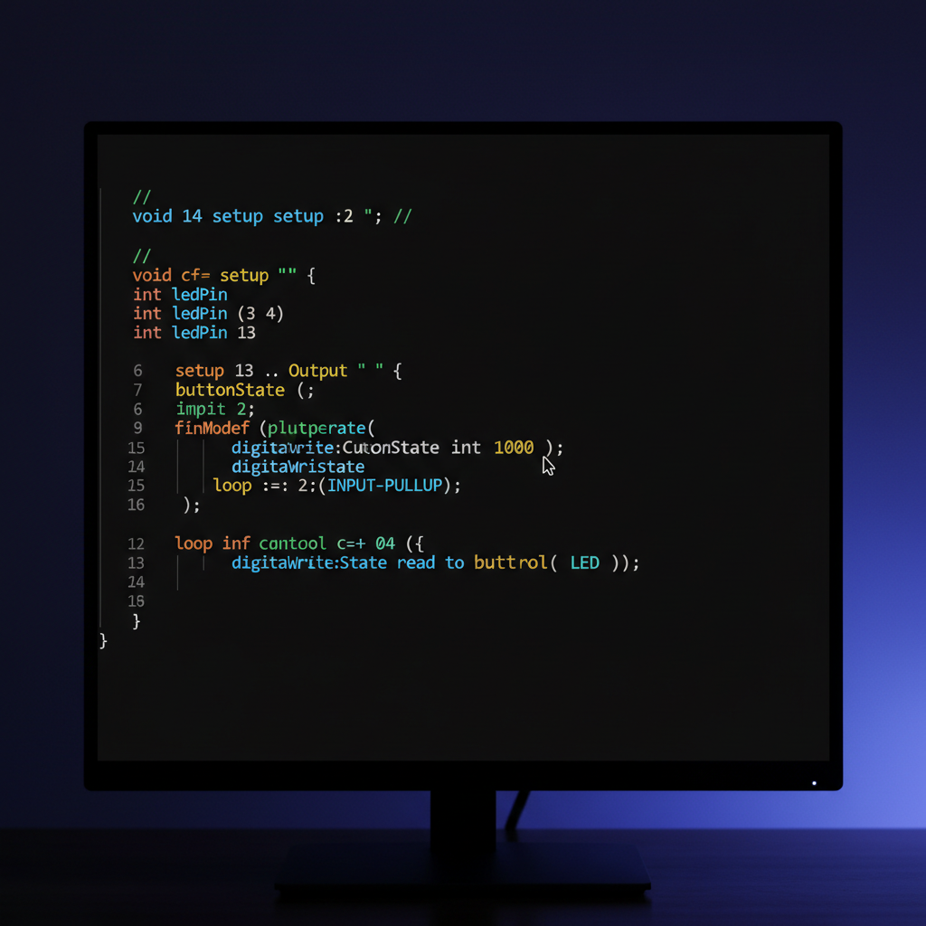 Tinkercad-та 'Code' бөлімін ашып, 'Text' режимін таңдаймыз. <br><br><code>int pirPin = 2;</code> <br><code>int ldrPin = A0;</code> <br><code>int ledPin = 13;</code> <br><br>Setup функциясында: <br><code>pinMode(pirPin, INPUT);</code><br><code>pinMode(ldrPin, INPUT);</code><br><code>pinMode(ledPin, OUTPUT);</code>
