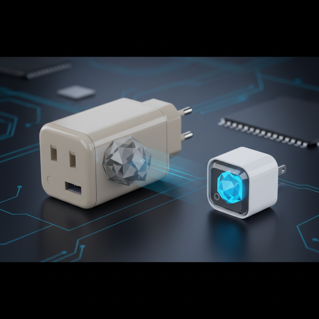 Gallium Nitride (GaN) replaced Silicon in high-end chargers. GaN conducts electrons more efficiently and generates less heat, allowing manufacturers to pack 100W+ of power into a brick the size of a cookie.