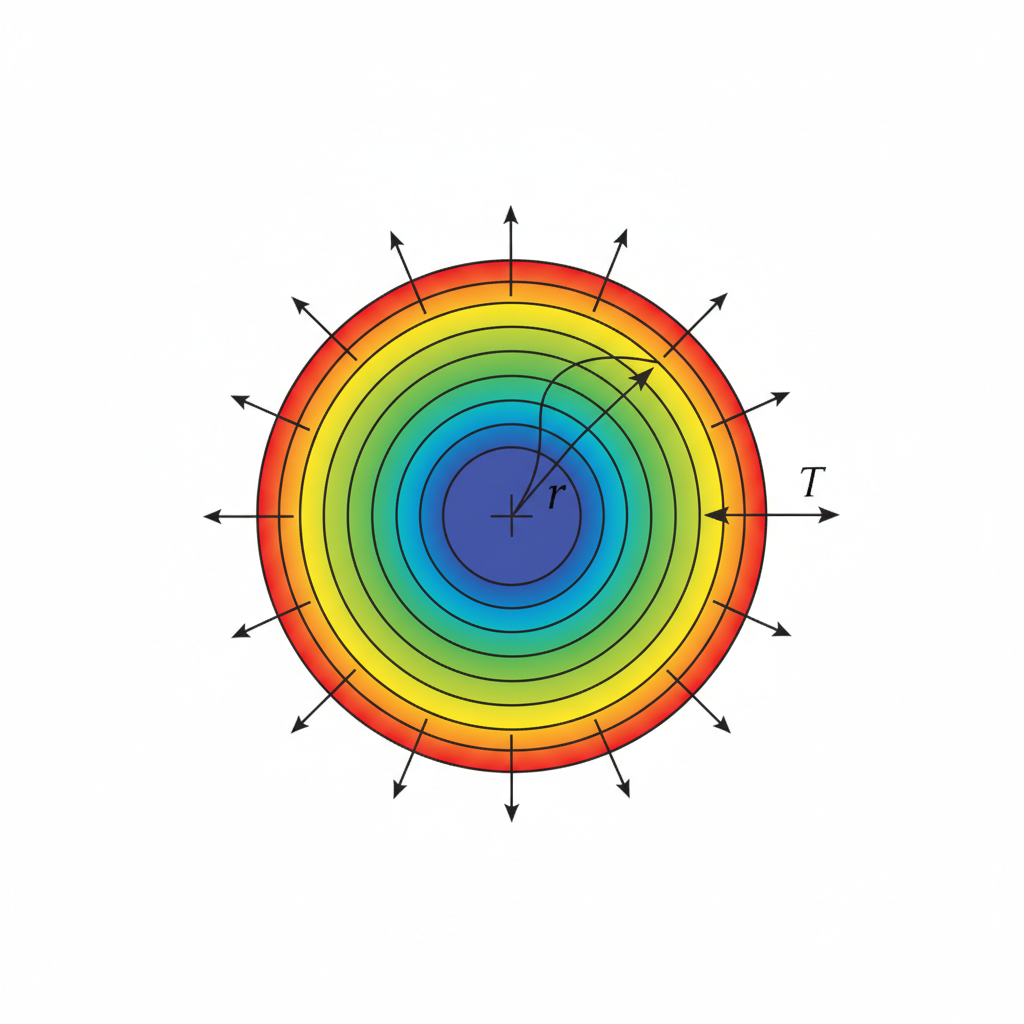 Electrical current flowing through a wire generates internal heat (S = I²R/V). Because the wire is cylindrical, heat must flow radially outward to the surface to dissipate. The temperature is highest at the center line and drops quadratically towards the surface. Key Result: T_center = T_surface + (q_gen * R²) / (4k) This analysis is crucial for determining the maximum current capacity (ampacity) of cables to prevent melting.