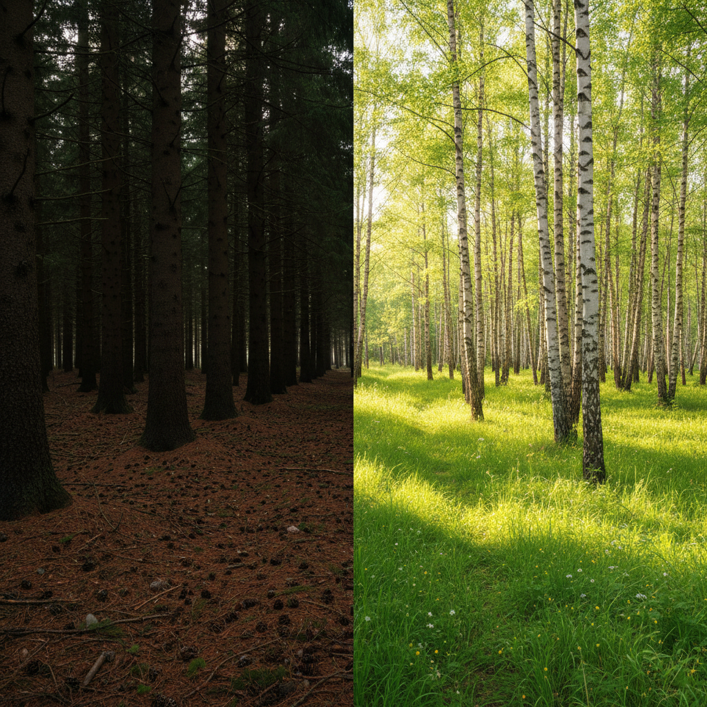 Почему в густом еловом лесу практически не растет трава, а почва покрыта только слоем опавшей хвои, в то время как в березовой роще травяной покров густой и зеленый?