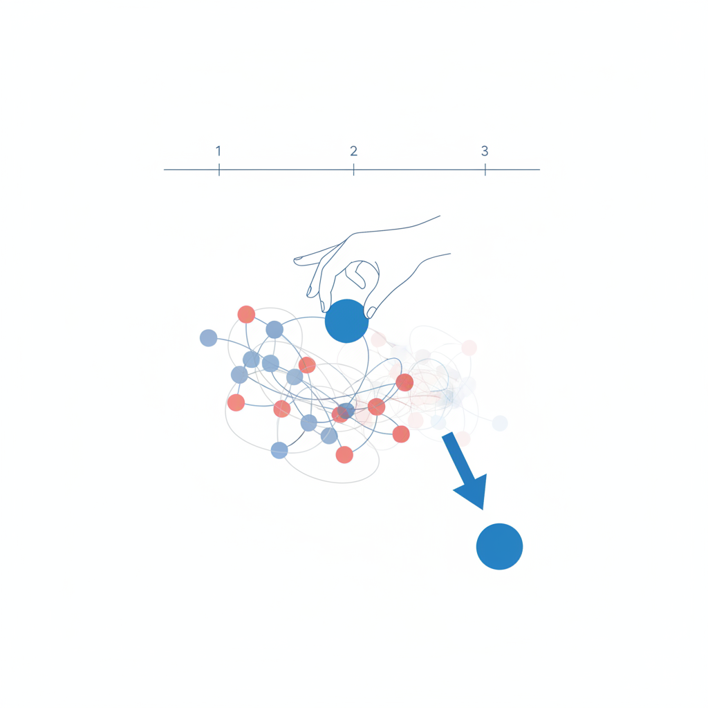 <div style="font-size:0.9em;"> <p style="margin-bottom:15px; border-left:4px solid #3498db; padding-left:15px;">All cells start in the same state</p> <p style="margin-bottom:15px; border-left:4px solid #3498db; padding-left:15px;">Cells gradually increase their tendency to become SOP</p> <p style="margin-bottom:15px; border-left:4px solid #3498db; padding-left:15px;">Small random differences appear between neighboring cells</p> <p style="margin-bottom:15px; border-left:4px solid #3498db; padding-left:15px;">A cell that becomes slightly ahead inhibits its neighbors</p> <p style="margin-bottom:15px; border-left:4px solid #3498db; padding-left:15px;">Inhibition amplifies this difference and prevents neighbors from catching up</p> <div style="margin-top:30px; background:#e8f4fd; padding:20px; border-radius:15px; color:#2c3e50; font-weight:600;"> Outcome: A single SOP is selected from a symmetric group. </div> </div>