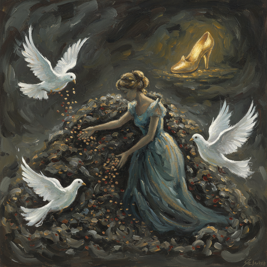 Weibliche Rolle: Passiv, demütig, häuslich. Aschenputtel erduldet Leid und wird durch göttliche Fügung (Muttergeist, Tiere) belohnt.