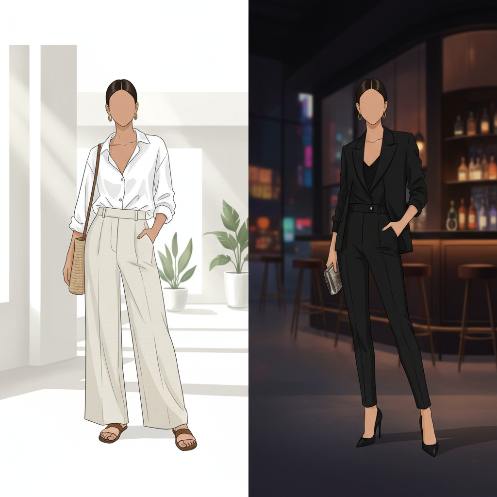 NIGHT: Add Oversized Blazer + Switch to Heels + Add Gold Earrings + Clutch. Ready for industry dinners.