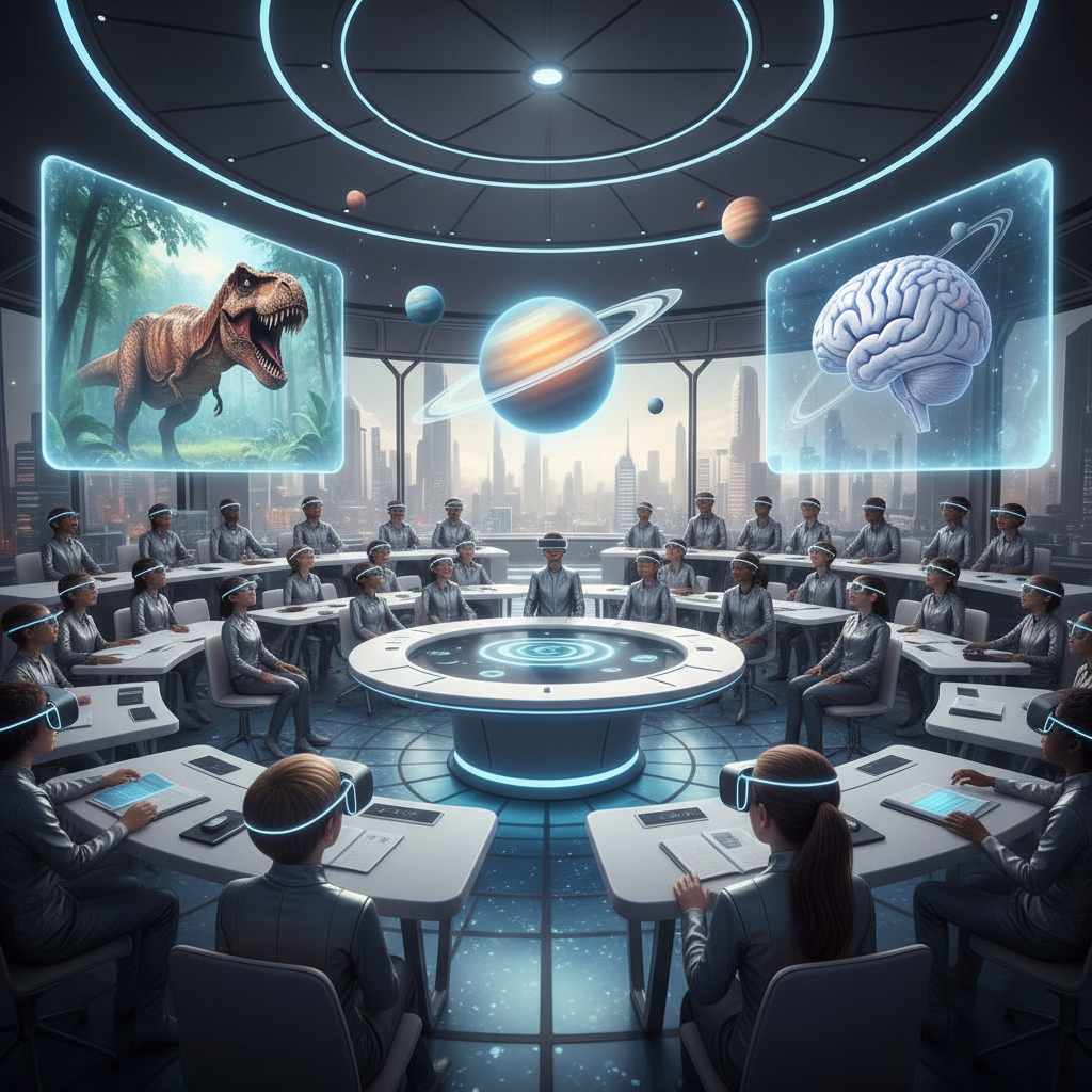 Statt nur Bücher zu lesen, erleben wir Geschichte hautnah. Mit Virtual Reality (VR) Brillen reisen wir ins alte Rom oder in den menschlichen Körper. Lehrer sind Lernbegleiter, und Künstliche Intelligenz hilft jedem Schüler individuell dort, wo er Probleme hat.