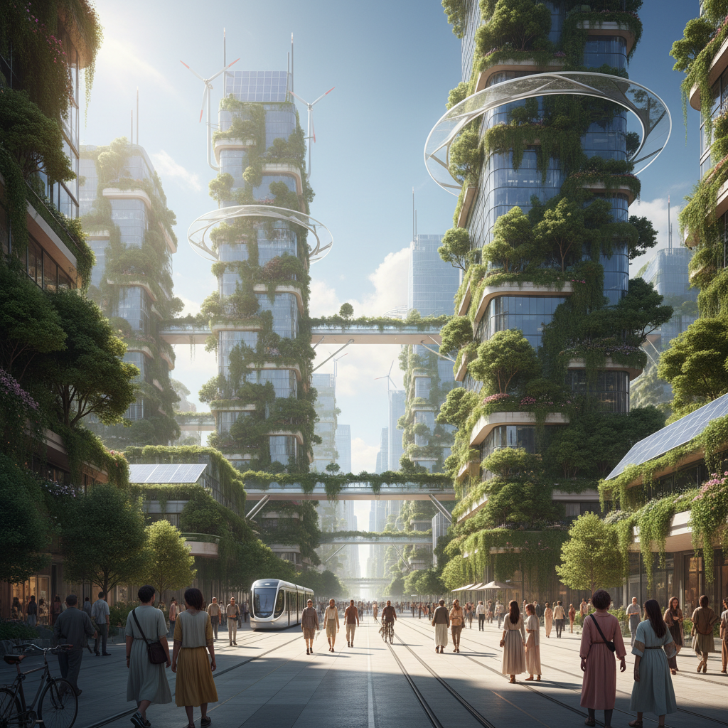Die Städte der Zukunft sind grün! Häuserwände sind mit Pflanzen bedeckt ('Vertical Farming'), um die Luft zu reinigen und Essen direkt in der Stadt anzubauen. Energie kommt zu 100% aus Sonne, Wind oder Wasserstoff. Müll wird von Robotern perfekt recycelt.