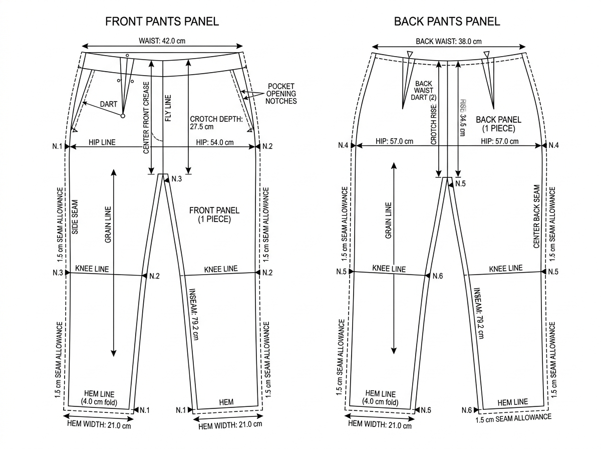 Step-by-step printable PDF sewing pattern for modern straight-leg trousers. Includes detailed measurements, cutting instructions, and assembly tips.