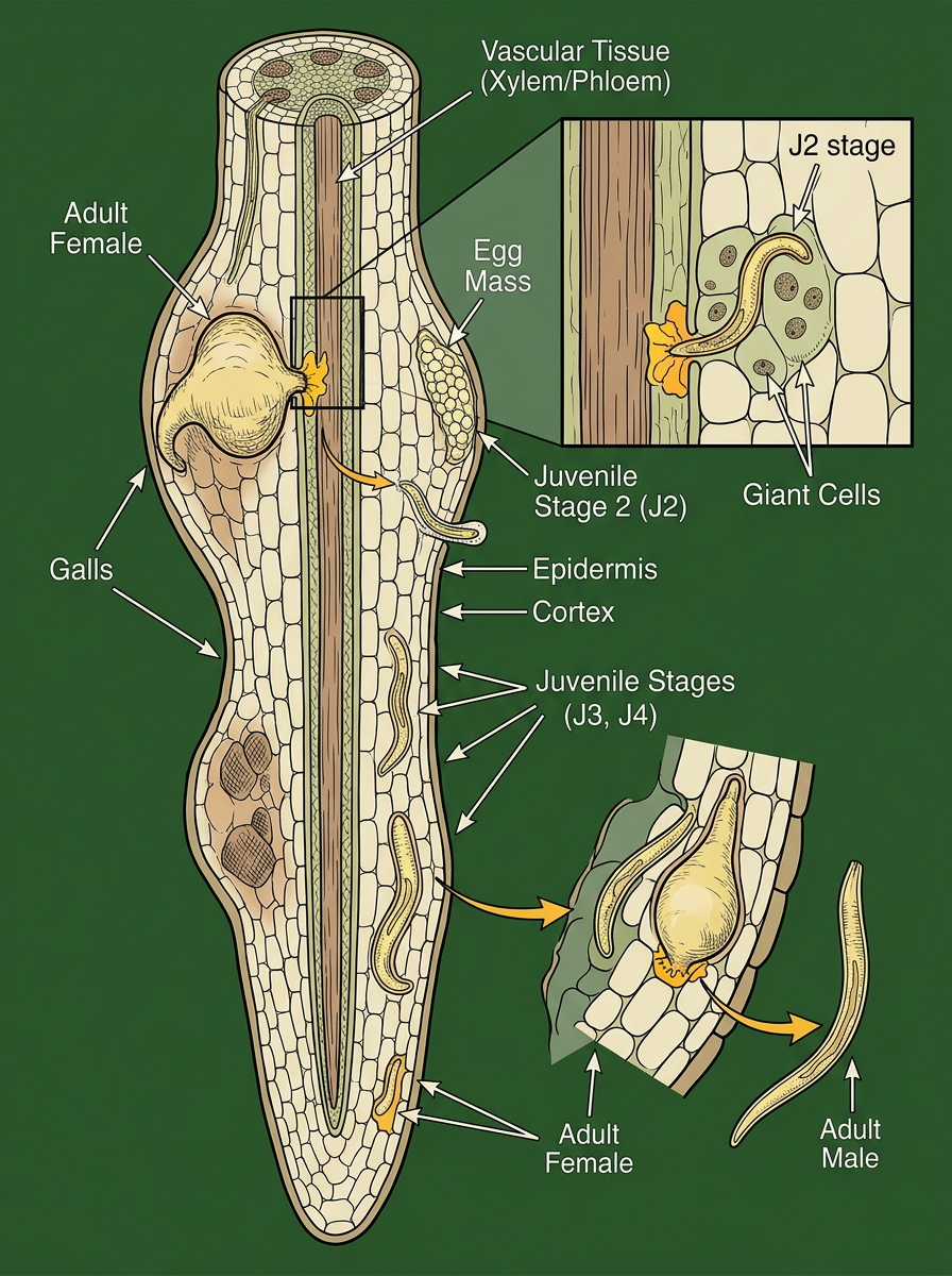 J2 enters near root tip; migrates to vascular tissue