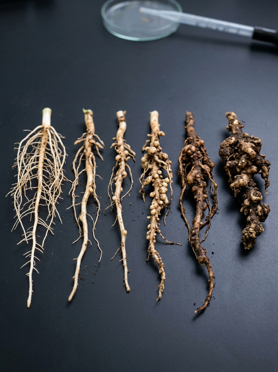 Root galls / knots (characteristic of Meloidogyne)