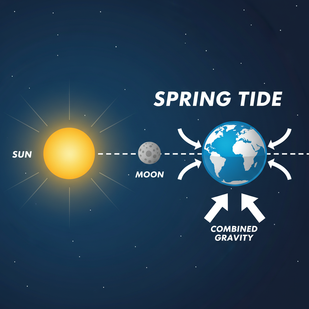Occur during New and Full Moons. The Sun, Moon, and Earth align in a straight line. Their gravitational forces combine (constructive interference), creating higher highs and lower lows.