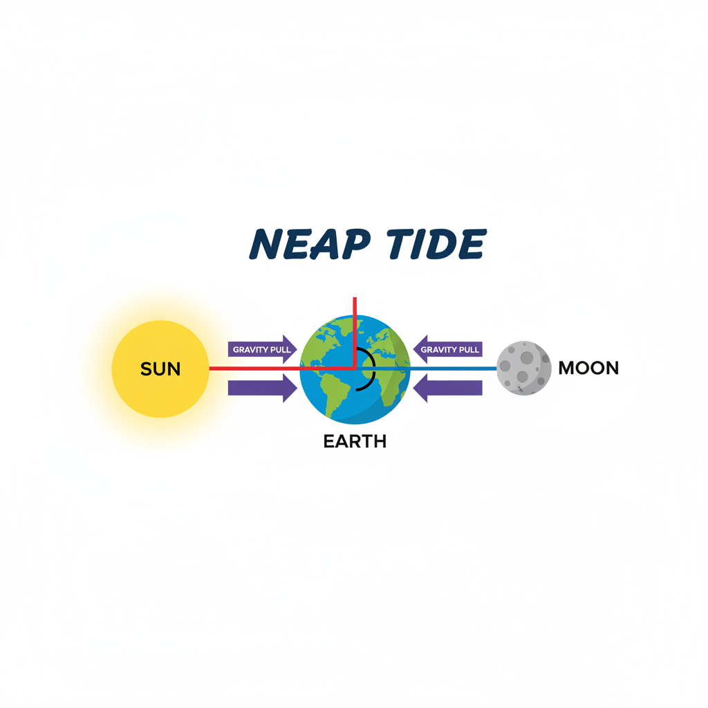 Occur during First and Third Quarter Moons. The Sun and Moon are at a 90° angle. Solar gravity partially counteracts Lunar gravity (destructive interference), creating smaller tidal variations.