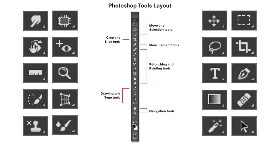 Move Tool (V): Moves layers using drag-and-drop. Always check your selected layer first.