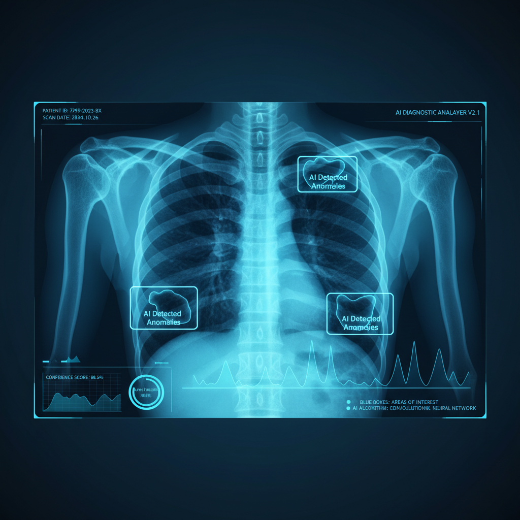 <b>Diagnose & Bilderkennung</b><br>KI kann Tausende von Röntgenbildern analysieren und Krankheiten oft früher erkennen als das menschliche Auge (z.B. Lungenkrankheiten).