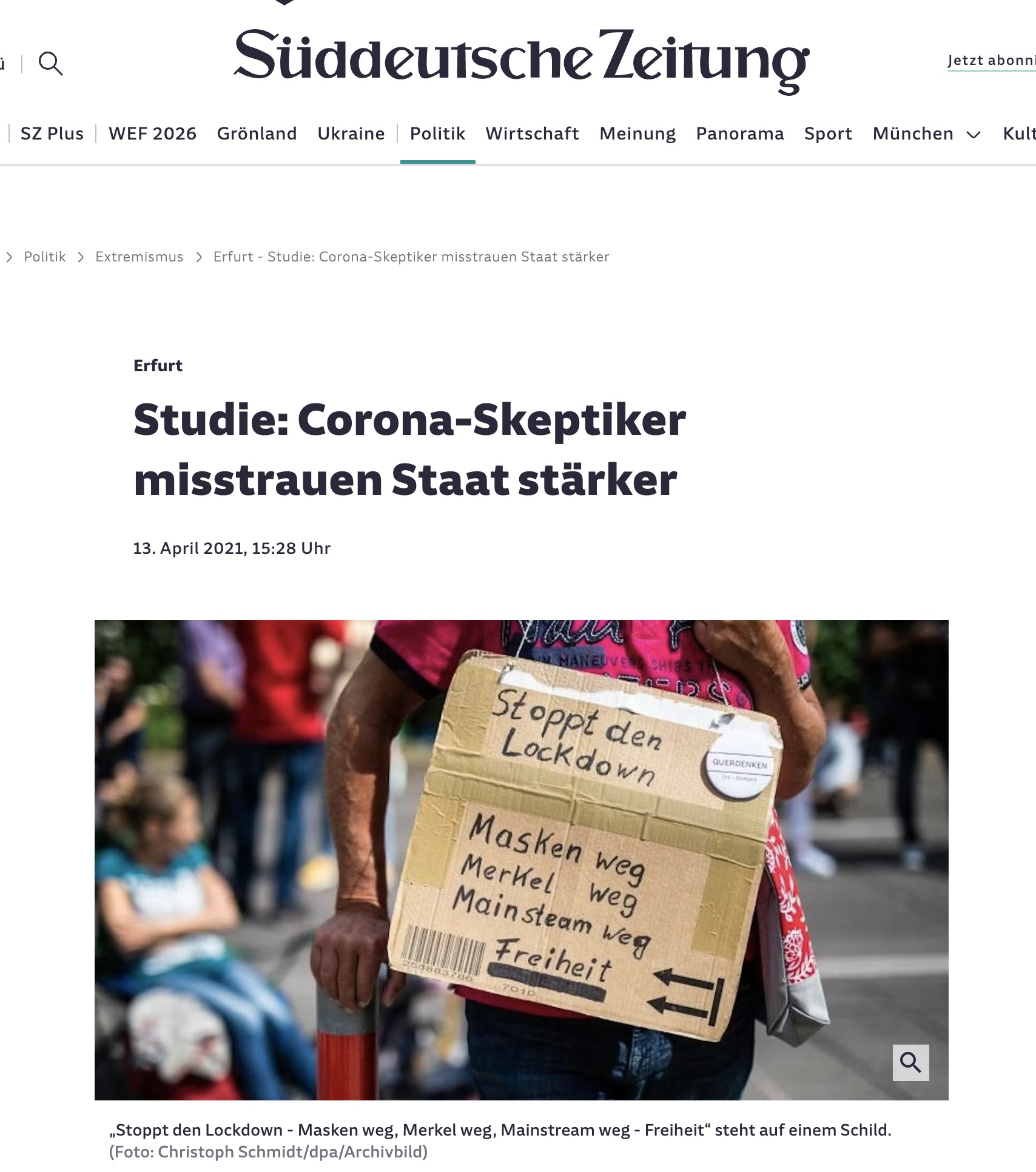 Überschrift: 'Corona-Skeptiker misstrauen Staat stärker' (Erfurt Studie).