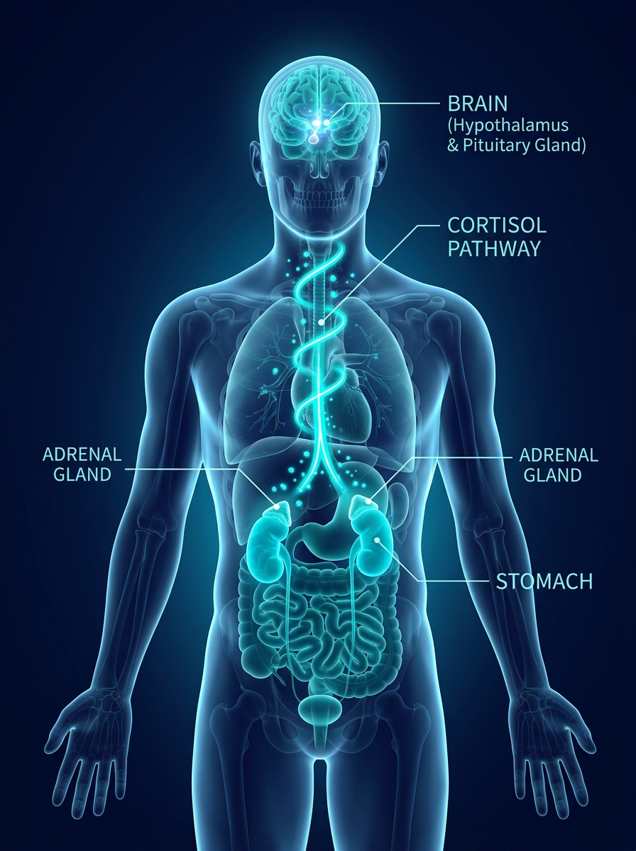 Cortisol disrupts ghrelin (hunger hormone) and leptin (satiety hormone), weakening the body's "full" signals