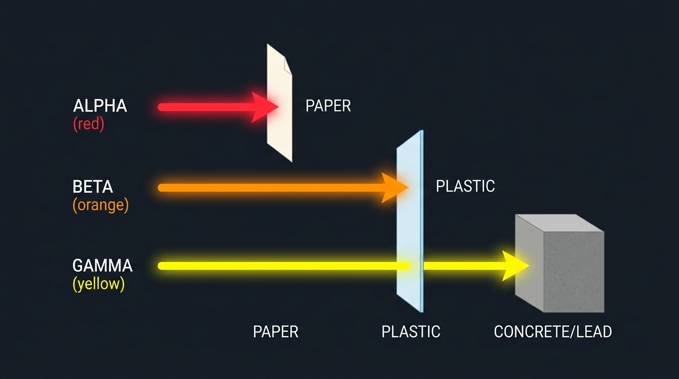 Low penetration — stopped by paper or skin. Most dangerous if inhaled.