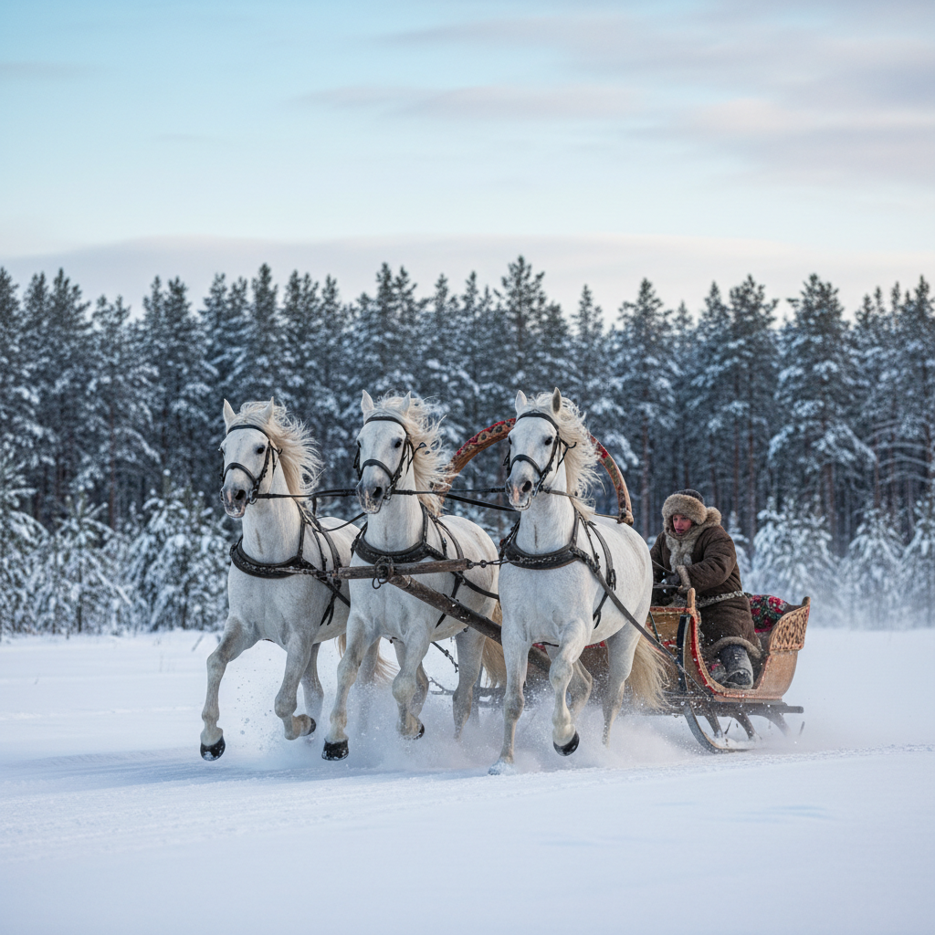 He rides a 'Troika', a traditional Russian sleigh drawn by three horses harnessed abreast. It is an iconic symbol of speed and Russian winter culture. Although he has magic, the Troika is his primary vehicle.
