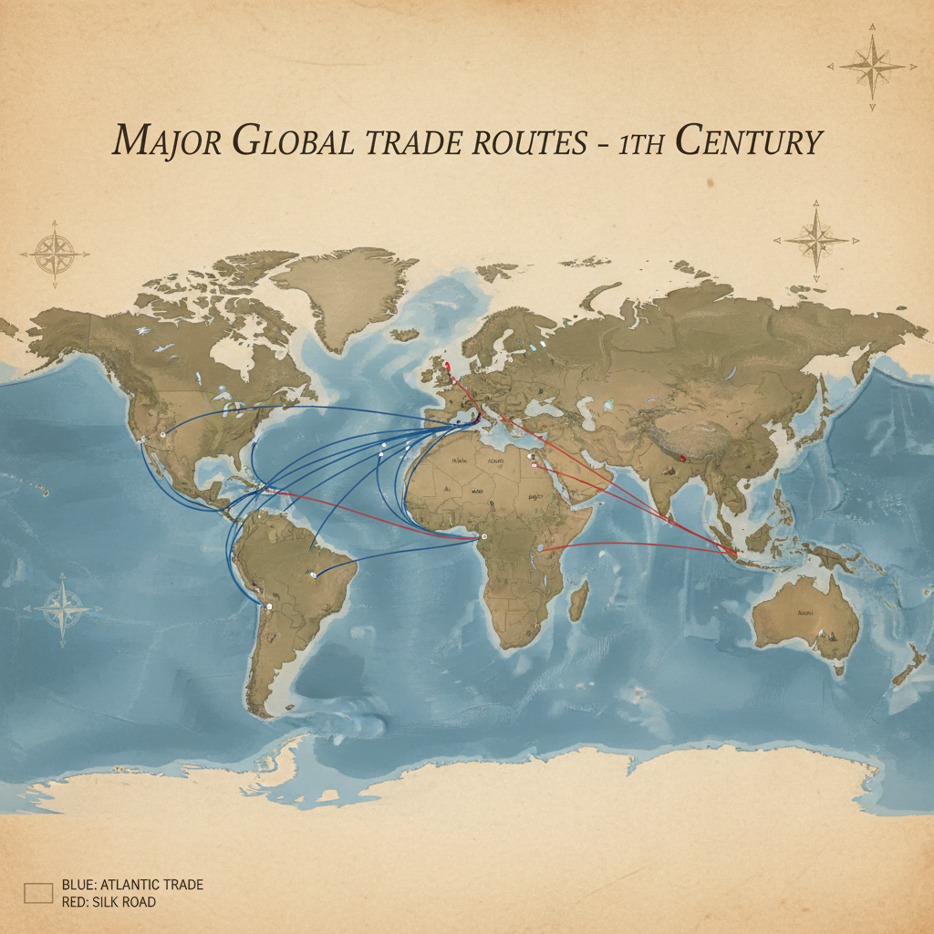Buyuk Geografik kashfiyotlardan so‘ng asosiy savdo yo‘llari O‘rta Yer dengizi va quruqlikdan (Buyuk Ipak yo‘li) Atlantika okeaniga ko‘chdi.