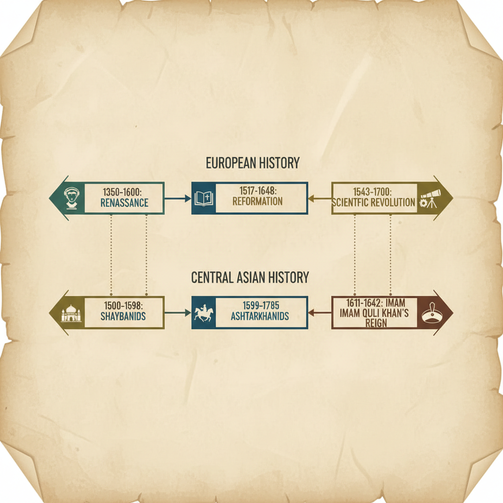 1611–1642: Imomqulixon davri (Buxoro barqarorligi) vs Angliya inqilobi.