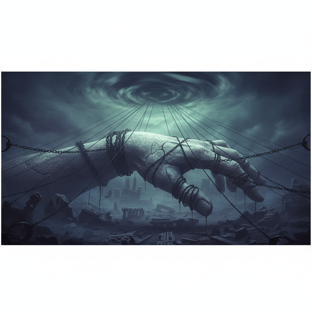 He wakes up unable to move, realizing he is tied down by thousands of tiny threads.