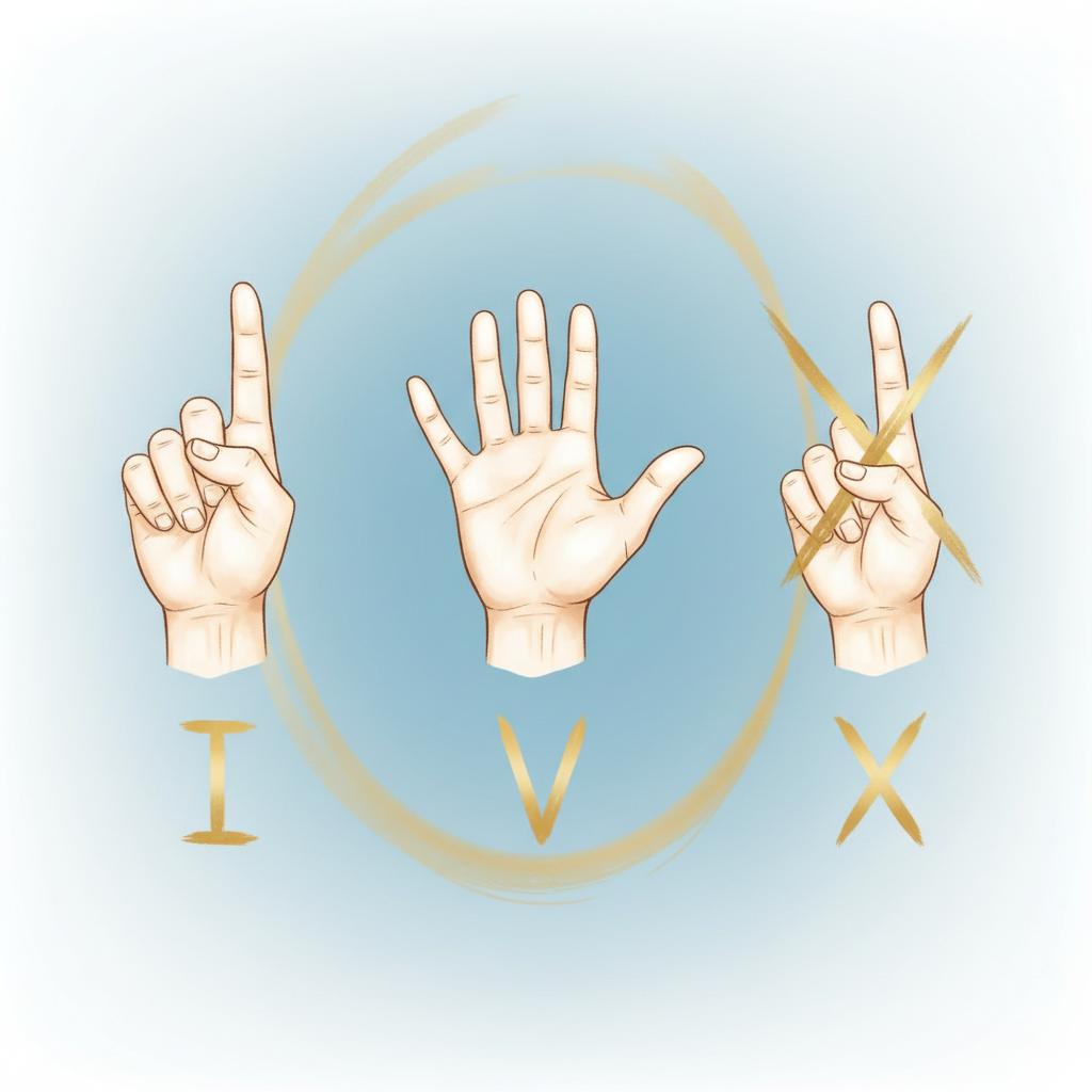'I' is one finger. 'V' is the shape of the thumb and forefinger spread apart. 'X' is two crossed hands.