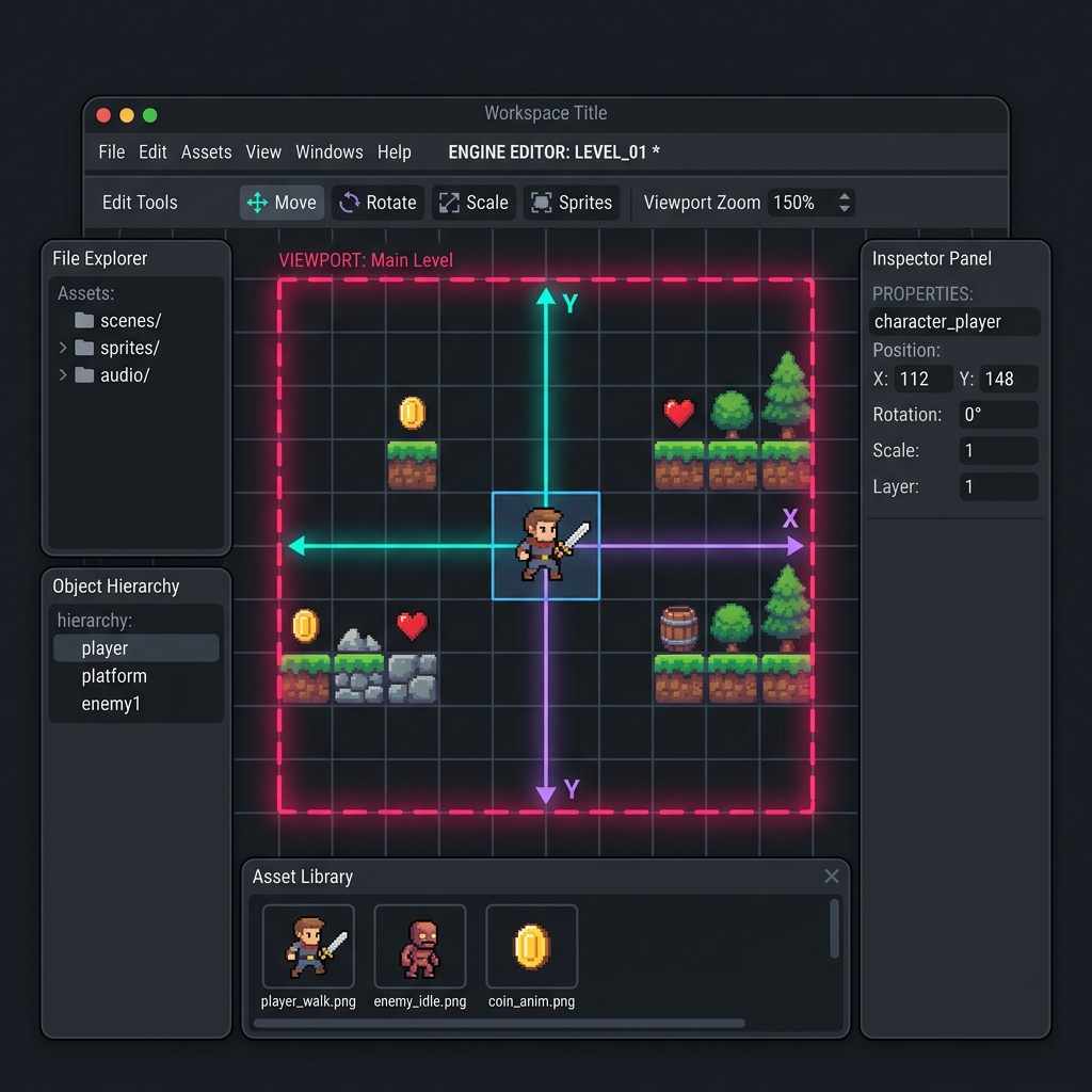 Sistema de organización espacial que determina el orden de renderizado (Z-order). Separa fondos, objetos de interacción e interfaz de usuario (UI).