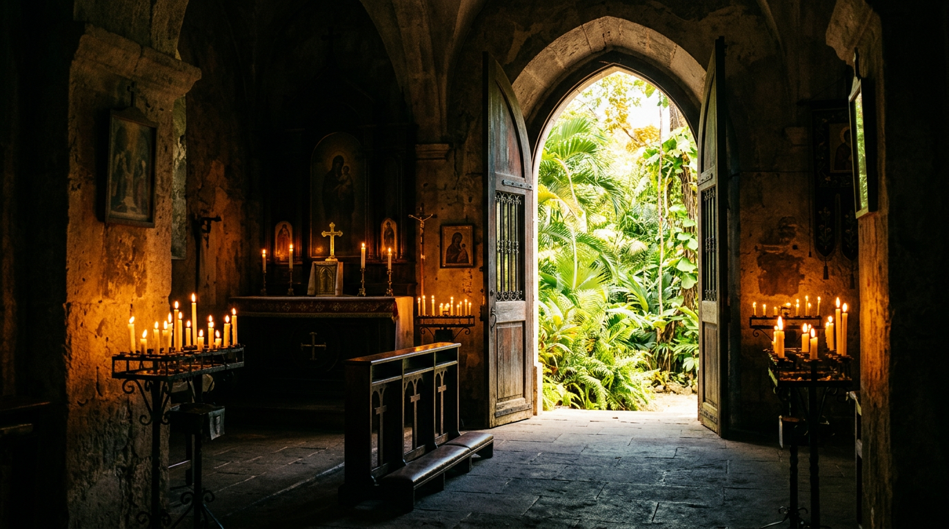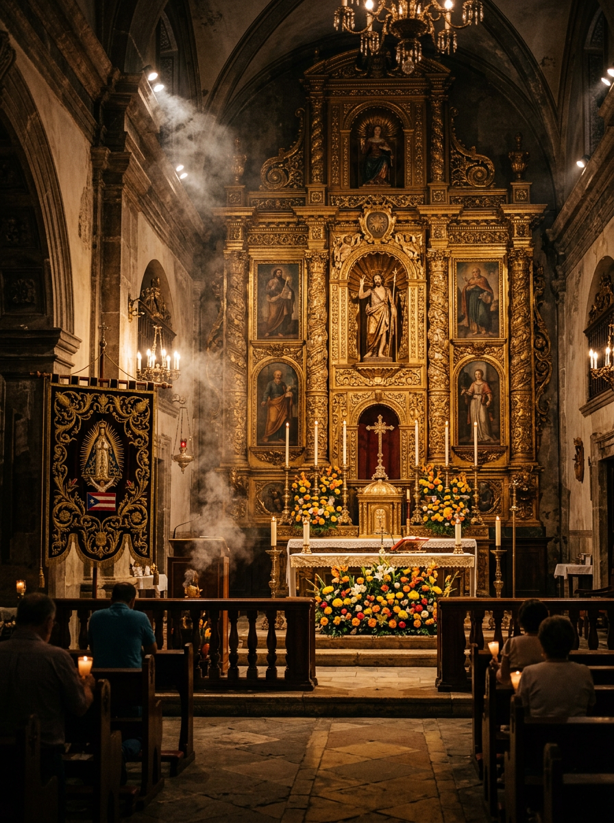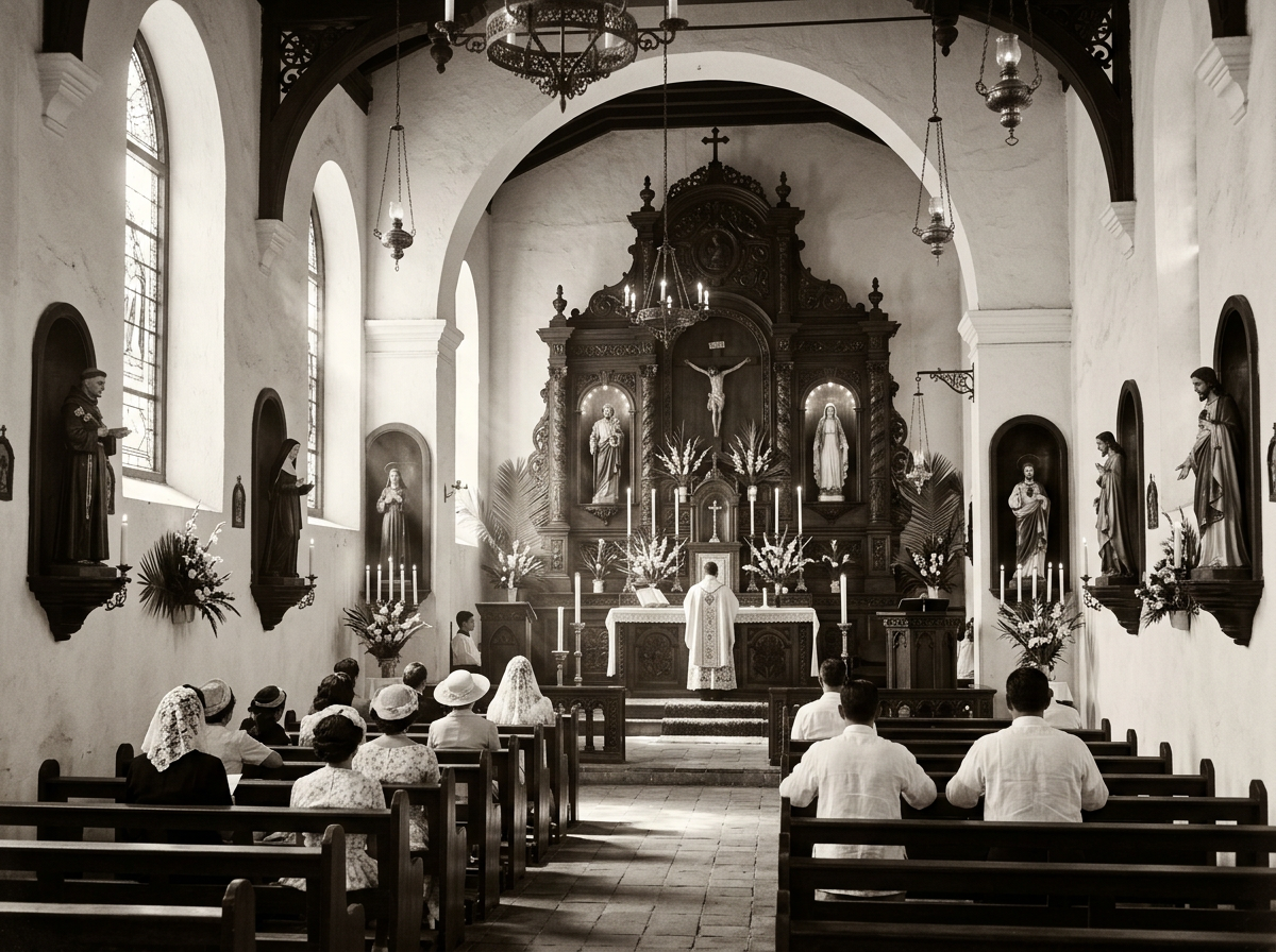 Gilded altarpieces, painted plaster saints, embroidered vestments, the incense smoke curling upward, the sound of the organ or the choir — all composed a sensory world of transcendence.