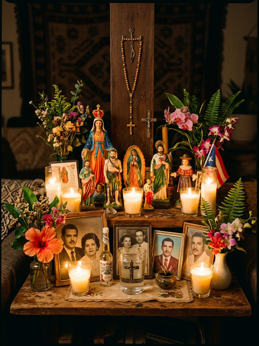 Beneath the official Catholic aesthetics of Puerto Rico runs a deeper, older current: <span style="color: #d8a47f; font-style: italic;">espiritismo</span> (spiritism, derived from Allan Kardec but thoroughly tropicalized) and elements of African-derived Lucumí/Santería religion.<br><br>These traditions have their own rich aesthetic systems — the colors of the orishas, the beaded necklaces (elekes), the ritual foods, the elaborate altars. For many Puerto Ricans across all three generations, these spiritual aesthetics exist quietly alongside (or beneath) Christianity — a syncretic sensory world that colonial authorities could never fully suppress.