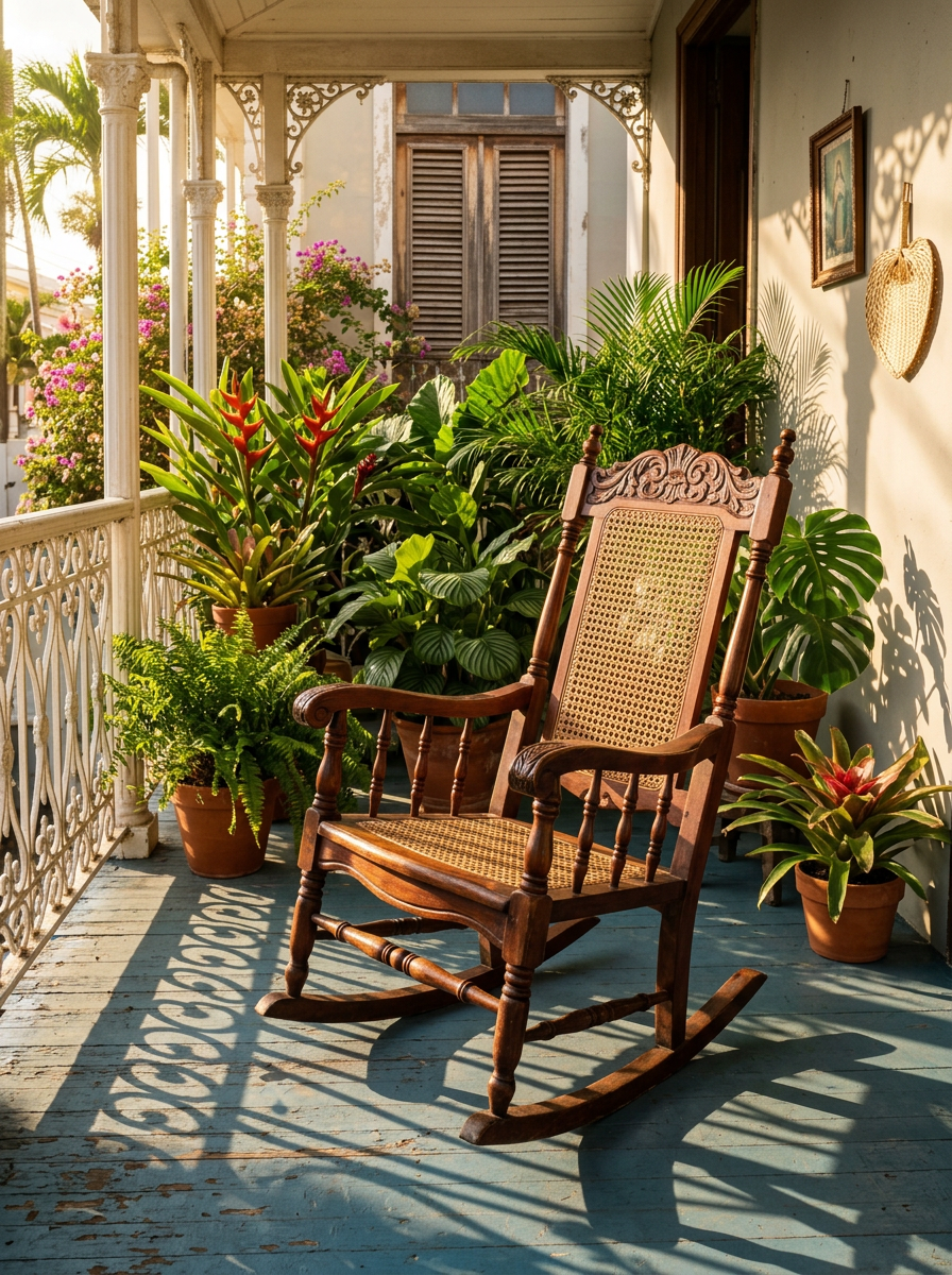The mecedora — the rocking chair — is one of Puerto Rico's most iconic aesthetic objects. To sit in it was to enter a rhythm: forward and back, past and present, effort and rest.<br><br>On the porch (<span style="font-style: italic; color: #d8a47f;">el balcón</span>), families watched the world, received neighbors, and performed the daily ritual of being seen and seeing. The porch was a stage, and every generation had its role.