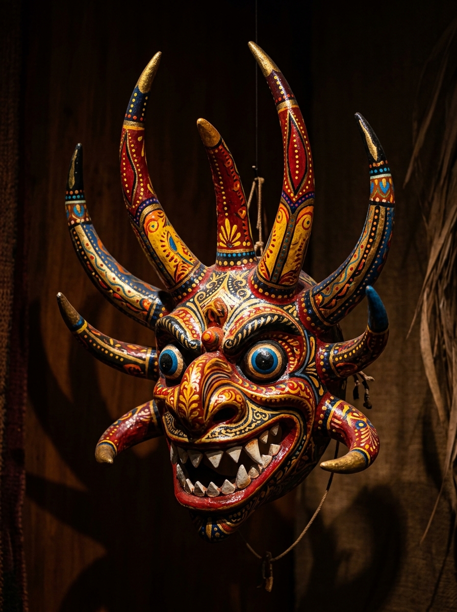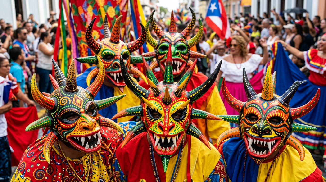 The vejigante mask is perhaps Puerto Rico's most recognizable aesthetic object. Made from papier-mâché (in Ponce) or coconut shells (in Loíza), painted in explosive color, studded with dozens of horns — they are an act of collective artmaking that collapses the boundary between the sacred and the carnivalesque. To wear the mask is to become something beyond yourself. To make it is to transform garbage and glue into transcendence.