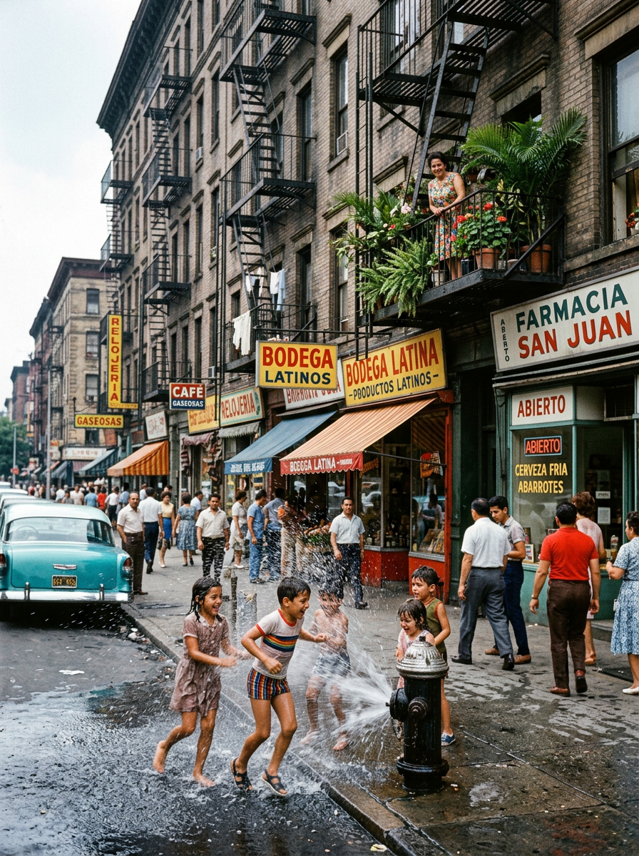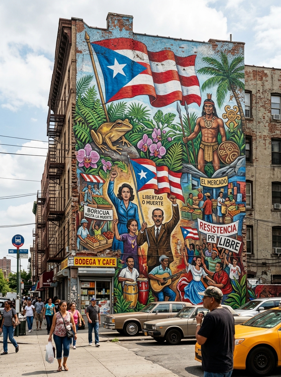 Between 1945 and 1965, nearly a third of Puerto Rico's population migrated to New York City. They carried their aesthetics with them: the bright colors, the saints on the mantle, the music, the food. In the cold gray of the South Bronx and East Harlem (El Barrio), these aesthetics became assertions of identity — a refusal to disappear into the American melting pot. The suitcase was packed not just with clothes, but with a visual and sensory world.