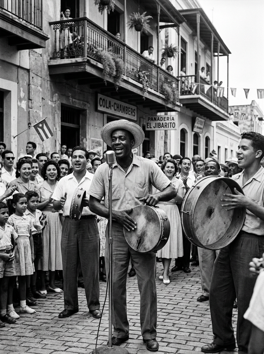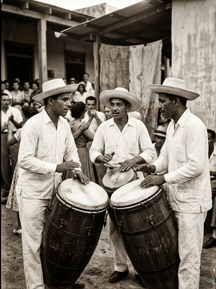 Sound was the wallpaper of this generation's world. The bolero — romantic, melancholic, ornate — narrated longing and love. The bomba and plena carried African memory in their rhythms, beaten into the present from bodies that refused to forget. Radio was the internet of the 1950s: a single receiver in the parlor that brought the world into the wooden house. Music was not entertainment — it was identity.