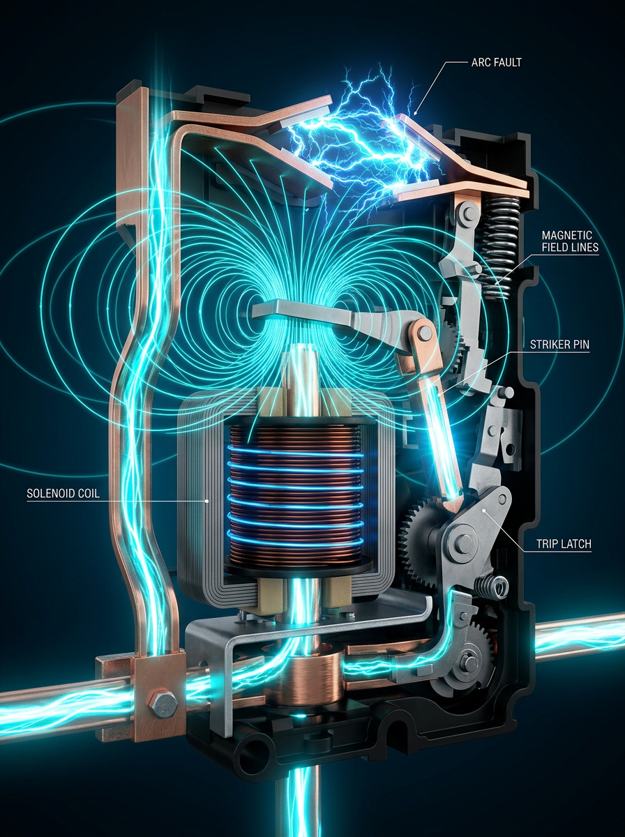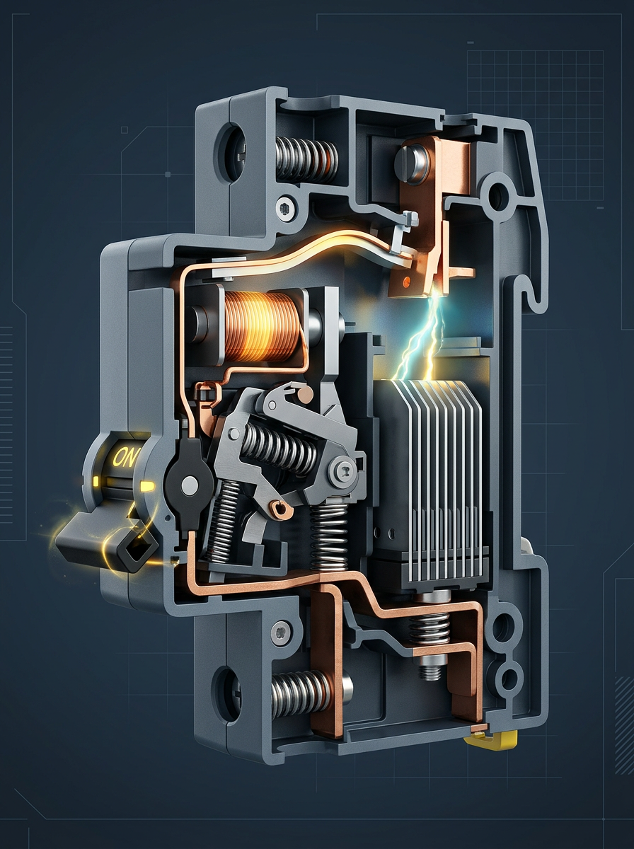Zwei Auslösemechanismen: Bimetall (langsam, Überlast) & Elektromagnet (schnell, Kurzschluss).